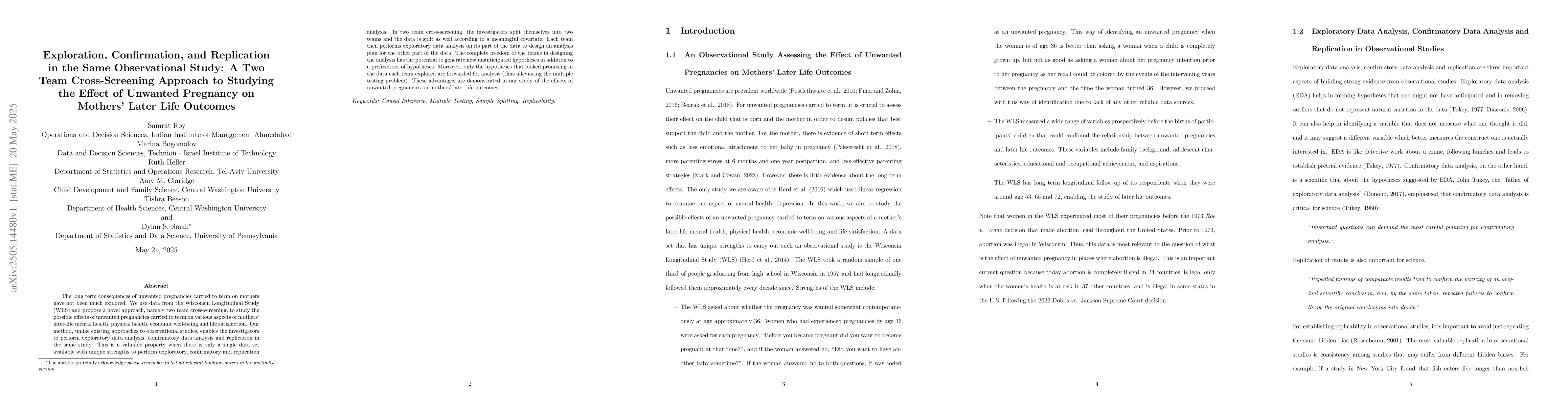 The long term consequences of unwanted pregnancies carried to term on mothers have not been much explored. We use data from the Wisconsin Longitudinal Study (WLS) and propose a novel approach, namely two team cross-screening, to study the possible effects of unwanted pregnancies carried to term on various aspects of mothers' later-life mental health, physical health, economic well-being and life satisfaction. Our method, unlike existing approaches to observational studies, enables the investigators to perform exploratory data analysis, confirmatory data analysis and replication in the same study. This is a valuable property when there is only a single data set available with unique strengths to perform exploratory, confirmatory and replication analysis. In two team cross-screening, the investigators split themselves into two teams and the data is split as well according to a meaningful covariate. Each team then performs exploratory data analysis on its part of the data to design an analysis plan for the other part of the data. The complete freedom of the teams in designing the analysis has the potential to generate new unanticipated hypotheses in addition to a prefixed set of hypotheses. Moreover, only the hypotheses that looked promising in the data each team explored are forwarded for analysis (thus alleviating the multiple testing problem). These advantages are demonstrated in our study of the effects of unwanted pregnancies on mothers' later life outcomes.