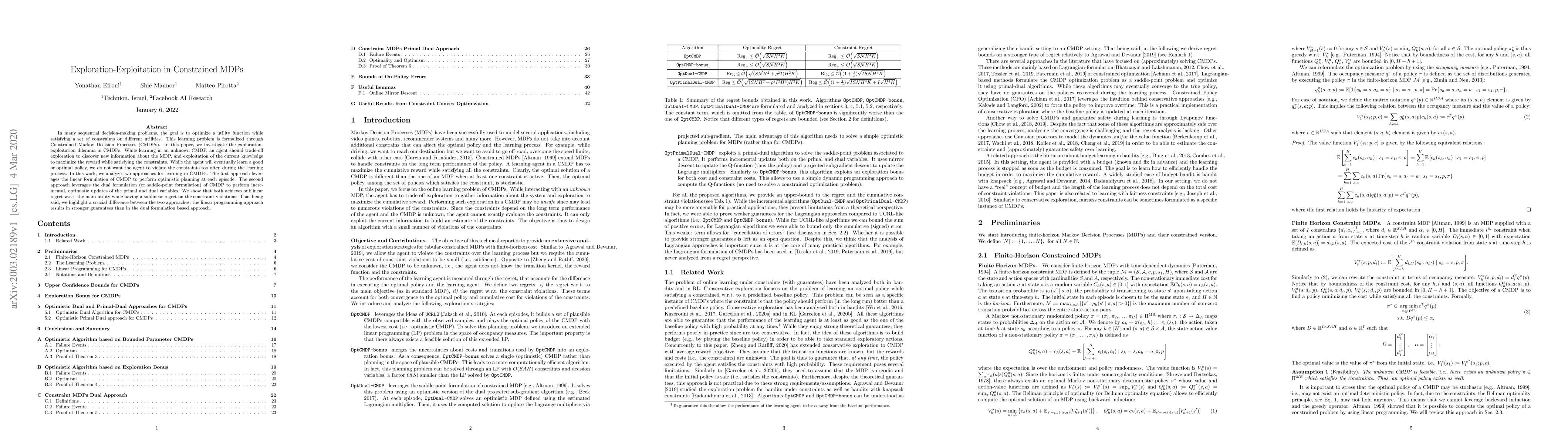 This paper explores the exploration-exploitation dilemma in Constrained Markov Decision Processes (CMDPs), proposing two approaches for learning in CMDPs with strong guarantees on sublinear regret and constraint violations.