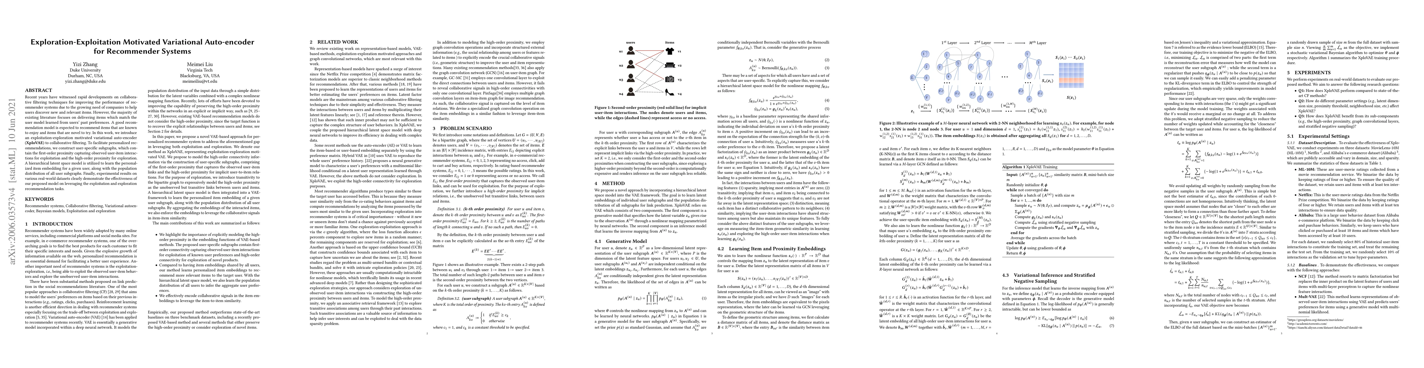 This paper proposes an exploitation-exploration motivated variational auto-encoder (XploVAE) for recommender systems to balance recommending known liked items and novel items. The model constructs user-specific subgraphs for personalized recommendations and demonstrates improved performance on real-world datasets.