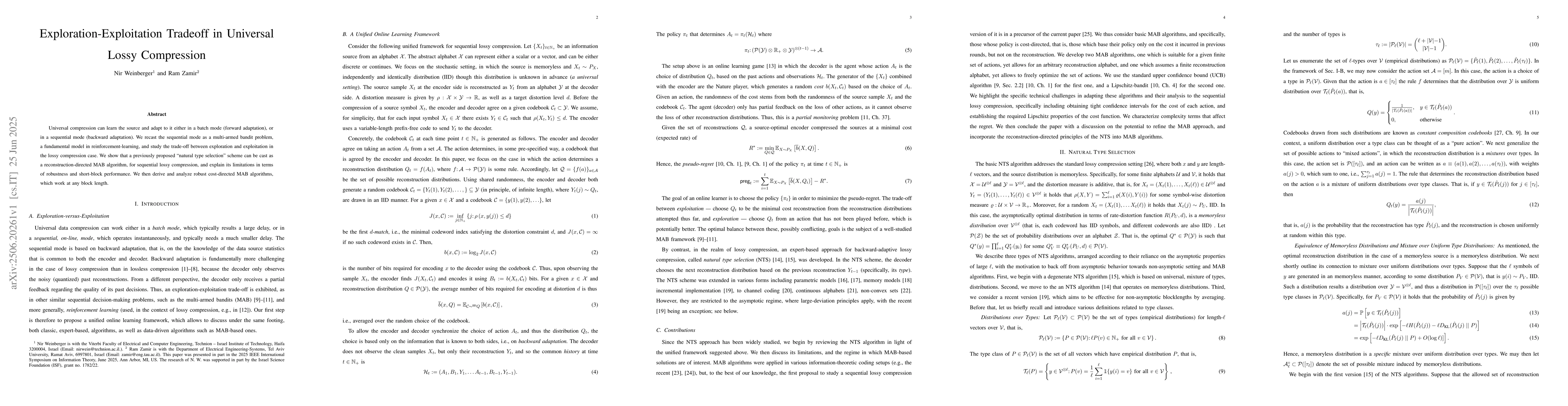 Universal compression can learn the source and adapt to it either in a batch mode (forward adaptation), or in a sequential mode (backward adaptation). We recast the sequential mode as a multi-armed bandit problem, a fundamental model in reinforcement-learning, and study the trade-off between exploration and exploitation in the lossy compression case. We show that a previously proposed "natural type selection" scheme can be cast as a reconstruction-directed MAB algorithm, for sequential lossy compression, and explain its limitations in terms of robustness and short-block performance. We then derive and analyze robust cost-directed MAB algorithms, which work at any block length.