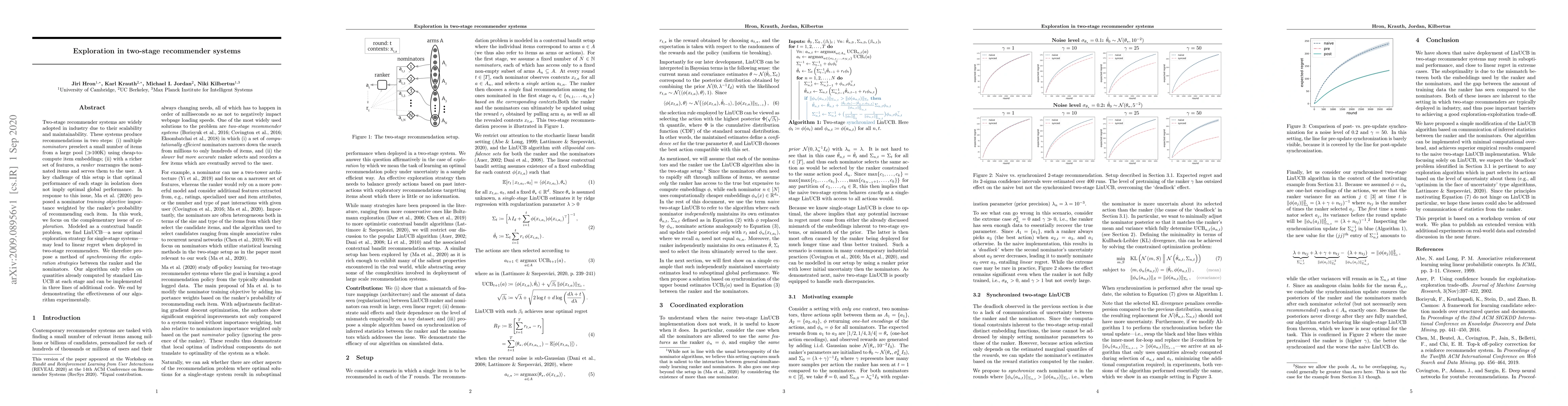 This paper explores the exploration challenge in two-stage recommender systems, proposing a method to synchronize exploration strategies between nominators and rankers. The authors find that traditional LinUCB can lead to linear regret in this context and introduce a minimal-code solution to improve global performance.