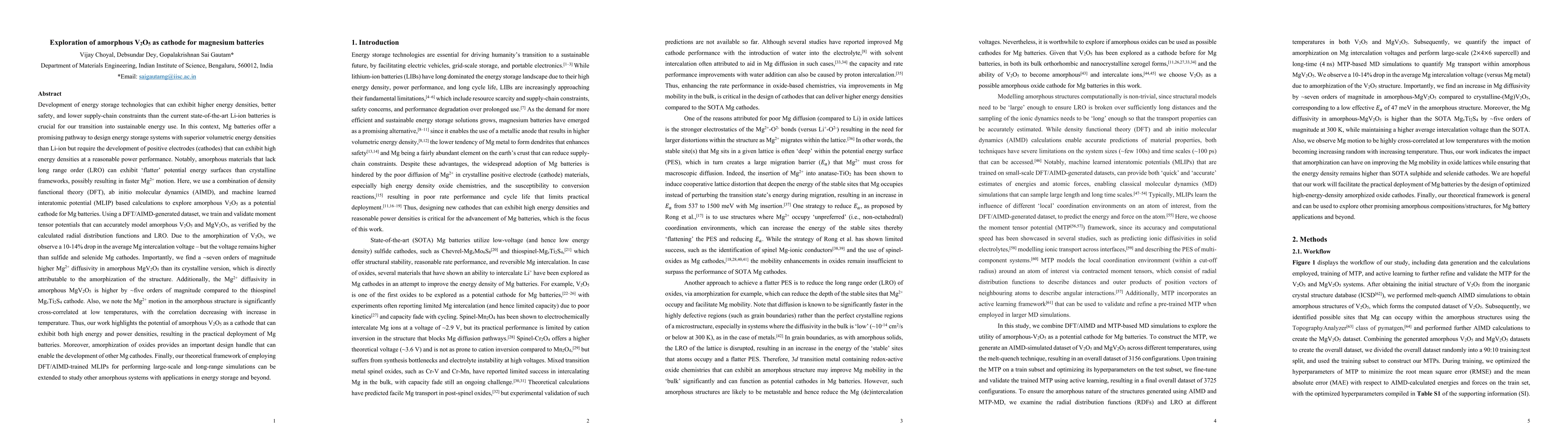 Development and validation of moment tensor potentials for accurate modeling of amorphous (Mg)V$_2$O$_5$ using AIMD-generated datasets.