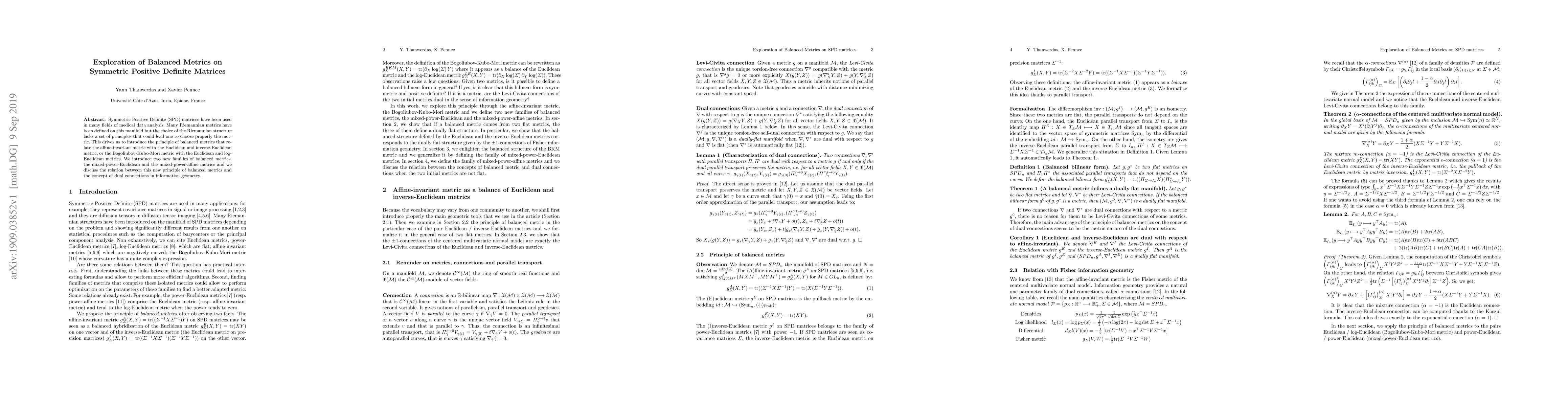 Symmetric Positive Definite (SPD) matrices have been used in many fields of medical data analysis. Many Riemannian metrics have been defined on this manifold but the choice of the Riemannian structure lacks a set of principles that could lead one to choose properly the metric. This drives us to introduce the principle of balanced metrics that relate the affine-invariant metric with the Euclidean and inverse-Euclidean metric, or the Bogoliubov-Kubo-Mori metric with the Euclidean and log-Euclidean metrics. We introduce two new families of balanced metrics, the mixed-power-Euclidean and the mixed-power-affine metrics and we discuss the relation between this new principle of balanced metrics and the concept of dual connections in information geometry.