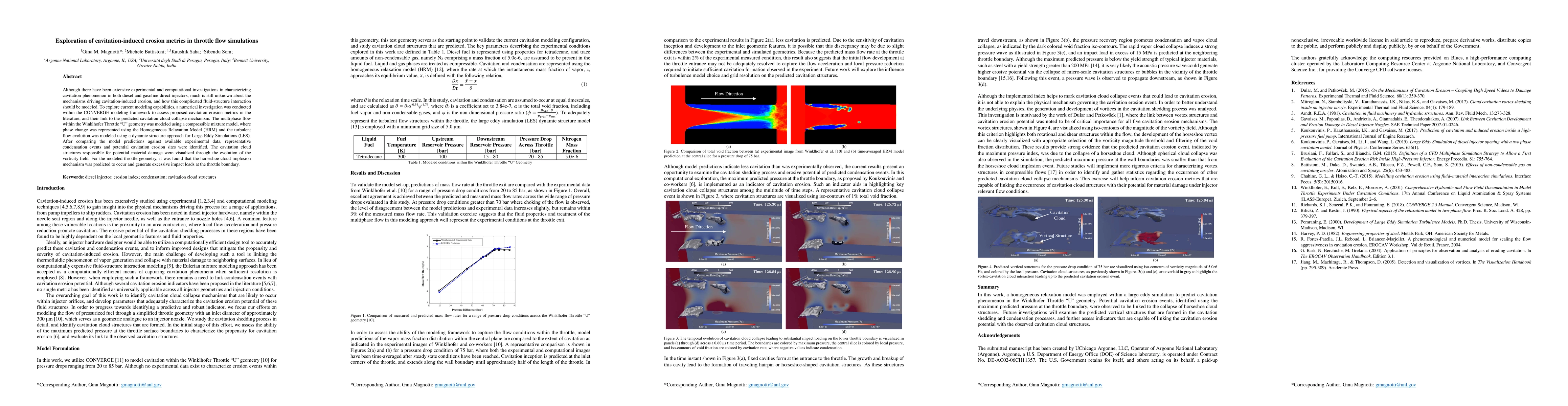 Although there have been extensive experimental and computational investigations in characterizing cavitation phenomenon in both diesel and gasoline direct injectors, much is still unknown about the mechanisms driving cavitation-induced erosion, and how this complicated fluid-structure interaction should be modeled. To explore current modeling capabilities, a numerical investigation was conducted within the CONVERGE modeling framework to assess proposed cavitation erosion metrics in the literature, and their link to the predicted cavitation cloud collapse mechanism. The multiphase flow within the Winklhofer Throttle U geometry was modeled using a compressible mixture model, where phase change was represented using the Homogeneous Relaxation Model (HRM) and the turbulent flow evolution was modeled using a dynamic structure approach for Large Eddy Simulations (LES). After comparing the model predictions against available experimental data, representative condensation events and potential cavitation erosion sites were identified. The cavitation cloud structures responsible for potential material damage were visualized through the evolution of the vorticity field. For the modeled throttle geometry, it was found that the horseshoe cloud implosion mechanism was predicted to occur and generate excessive impact loads at the throttle boundary.
