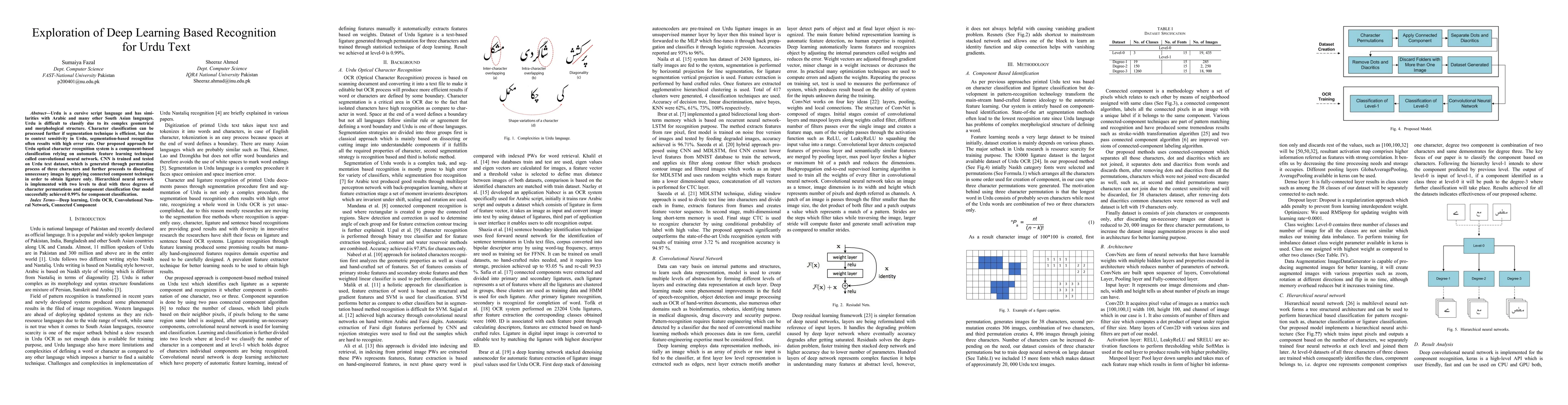 Urdu is a cursive script language and has similarities with Arabic and many other South Asian languages. Urdu is difficult to classify due to its complex geometrical and morphological structure. Character classification can be processed further if segmentation technique is efficient, but due to context sensitivity in Urdu, segmentation-based recognition often results with high error rate. Our proposed approach for Urdu optical character recognition system is a component-based classification relying on automatic feature learning technique called convolutional neural network. CNN is trained and tested on Urdu text dataset, which is generated through permutation process of three characters and further proceeds to discarding unnecessary images by applying connected component technique in order to obtain ligature only. Hierarchical neural network is implemented with two levels to deal with three degrees of character permutations and component classification Our model successfully achieved 0.99% for component classification.