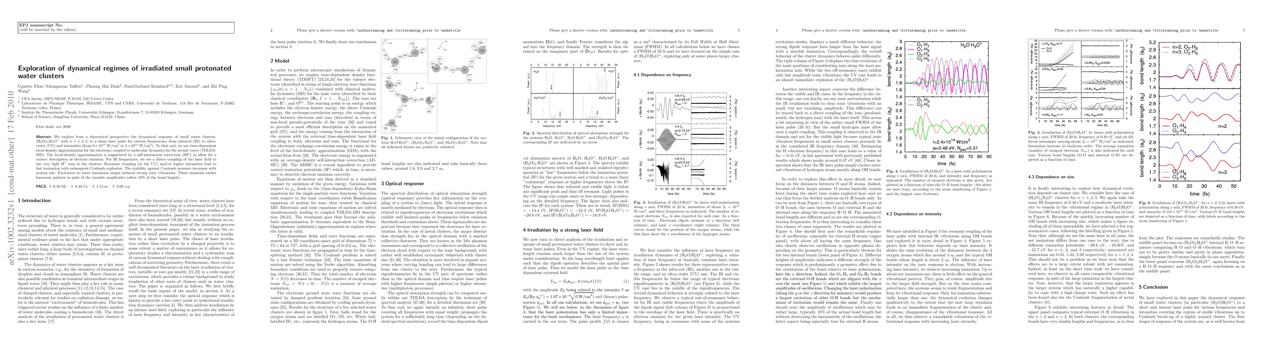 We explore from a theoretical perspective the dynamical response of small water clusters, (H$_2$O)$_n$H$_3$O$^+$ with $n=1,2,3$, to a short laser pulse for various frequencies, from infrared (IR) to ultra-violet (UV) and intensities (from $6\times10^{13}$ W/cm$^2$ to $5\times10^{14}$ W/cm$^2$). To that end, we use time-dependent local-density approximation for the electrons, coupled to molecular dynamics for the atomic cores (TDLDA-MD). The local-density approximation is augmented by a self-interaction correction (SIC) to allow for a correct description of electron emission. For IR frequencies, we see a direct coupling of the laser field to the very light H$^+$ ions in the clusters. Resonant coupling (in the UV) and/or higher intensities lead to fast ionization with subsequent Coulomb explosion. The stability against Coulomb pressure increases with system size. Excitation to lower ionization stages induced strong ionic vibrations. These maintain rather harmonic pattern in spite of the sizeable amplitudes (often 10% of the bond length).