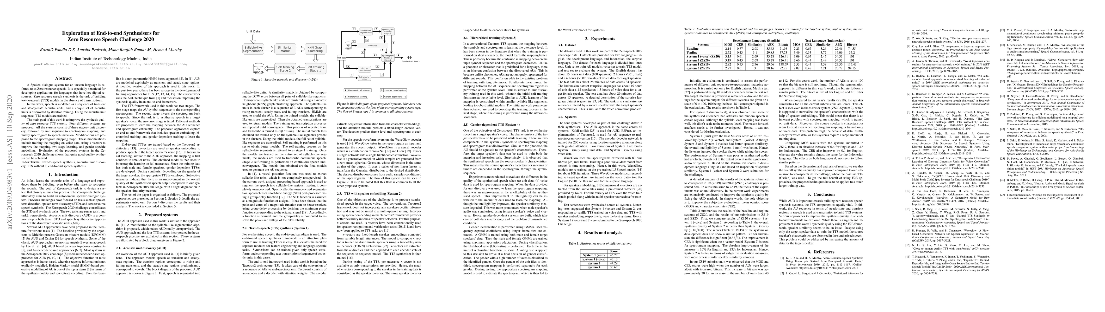 This paper explores end-to-end synthesizers for zero resource speech synthesis, focusing on building text-to-speech models for languages with limited digital resources. Four proposed systems aim to improve synthesis quality through iterative unit discovery and modifications to the spectrogram mapping stage, achieving good results in the Zerospeech 2020 challenge.