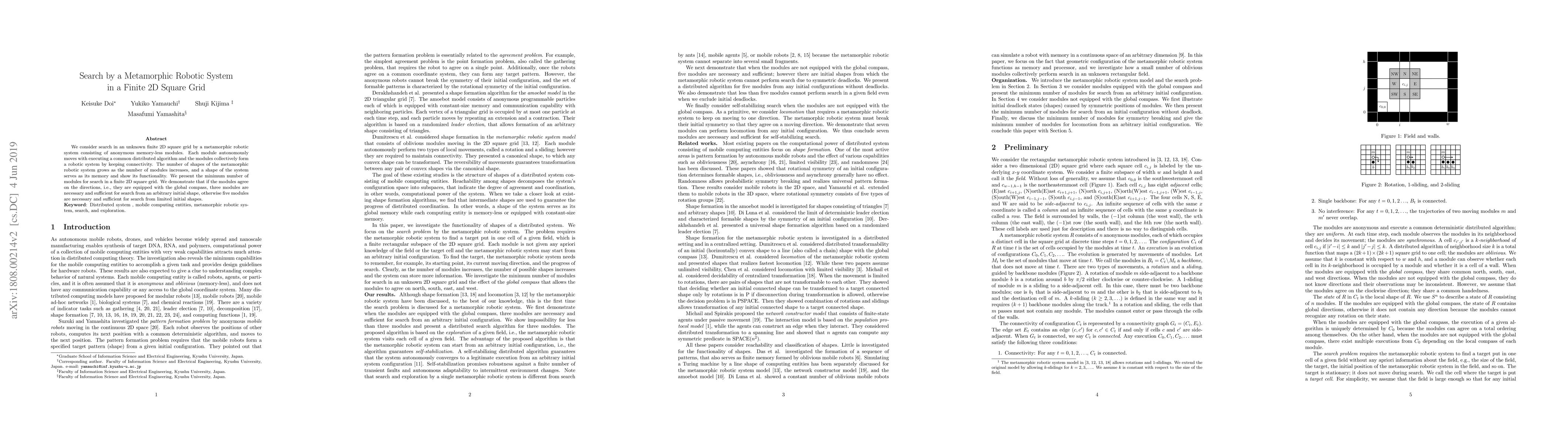 This research investigates how a system of shape-shifting robot modules, called metamorphic, can explore a 2D square grid. It finds that with a shared understanding of directions, three modules can explore anywhere. Without this shared direction sense, five modules are needed to explore from limited starting points.