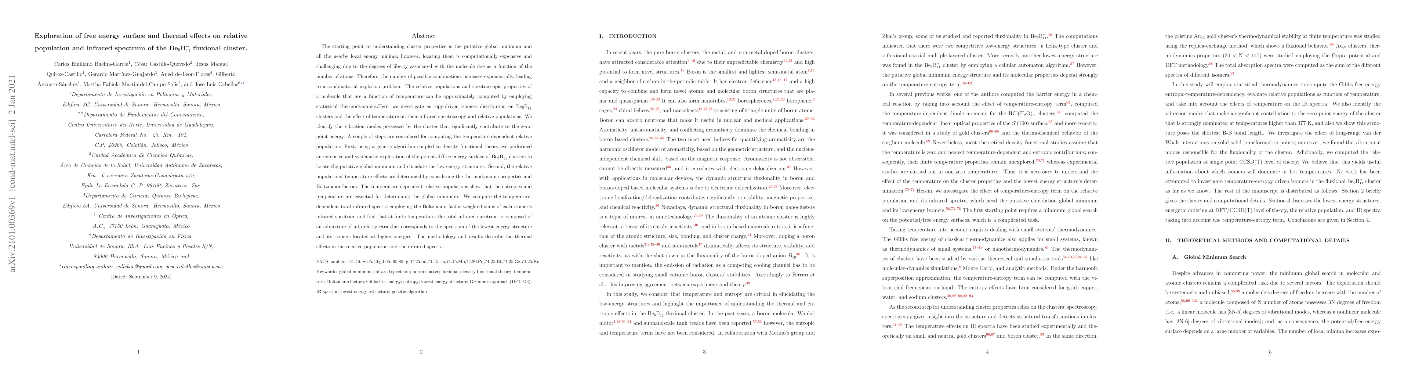 The starting point to understanding cluster properties is the putative global minimum and all the nearby local energy minima; however, locating them is computationally expensive and challenging due to a combinatorial explosion problem. The relative populations and spectroscopic properties of a molecule that are a function of temperature can be approximately computed by employing statistical thermodynamics. Here, we investigate temperature-entropy-driven isomers distribution on Be$_6$B$_{11}^{-}$ fluxional cluster and the effect of temperature on their infrared spectroscopy and relative populations. We identify the vibration modes possessed by the cluster that significantly contribute to the zero-point energy. A couple of steps are considered for computing the temperature-dependent relative population: First, using a genetic algorithm coupled to density functional theory, we performed an extensive and systematic exploration of the potential/free energy surface of Be$_6$B$_{11}^{-}$ cluster to locate the putative global minimum and elucidate the low-energy structures. Second, the relative populations' temperature effects are determined by considering the thermodynamic properties and Boltzmann factors. The temperature-dependent relative populations show that the entropies and temperature are essential for determining the global minimum. We compute the temperature-dependent total infrared spectra employing the Boltzmann factor weighted sums of each isomer's infrared spectrum and find that at finite temperature, the total infrared spectrum is composed of an admixture of infrared spectra that corresponds to the spectrum of the lowest energy structure and its isomers located at higher energies. The methodology and results describe the thermal effects in the relative population and the infrared spectra.