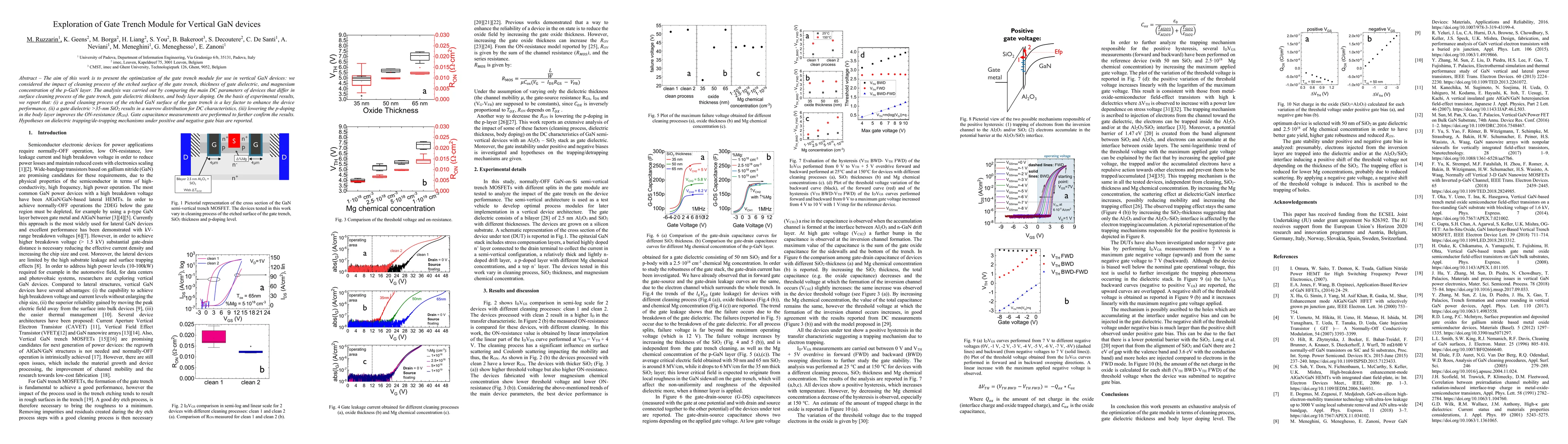 The aim of this work is to present the optimization of the gate trench module for use in vertical GaN devices in terms of cleaning process of the etched surface of the gate trench, thickness of gate dielectric and magnesium concentration of the p-GaN layer. The analysis was carried out by comparing the main DC parameters of devices that differ in surface cleaning process of the gate trench, gate dielectric thickness, and body layer doping. . On the basis of experimental results, we report that: (i) a good cleaning process of the etched GaN surface of the gate trench is a key factor to enhance the device performance, (ii) a gate dielectric >35-nm SiO2 results in a narrow distribution for DC characteristics, (iii) lowering the p-doping in the body layer improves the ON-resistance (RON). Gate capacitance measurements are performed to further confirm the results. Hypotheses on dielectric trapping/detrapping mechanisms under positive and negative gate bias are reported.