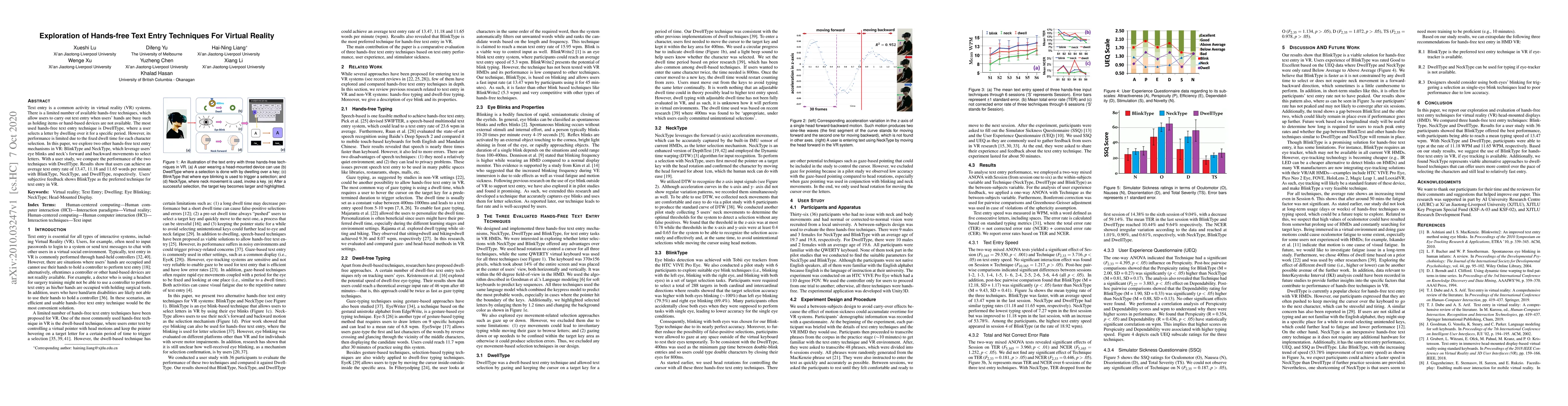 This paper explores two new hands-free text entry techniques, BlinkType and NeckType, for virtual reality, comparing them to the traditional DwellType. Results indicate BlinkType is the most efficient and preferred method for text entry in VR.
