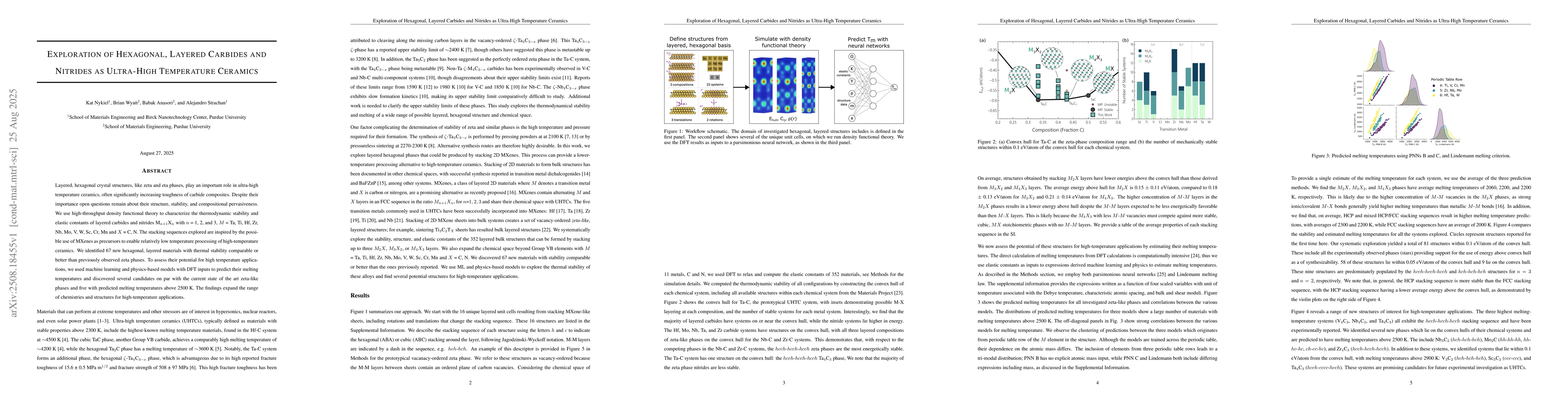 Layered, hexagonal crystal structures, like zeta and eta phases, play an important role in ultra-high temperature ceramics, often significantly increasing toughness of carbide composites. Despite their importance open questions remain about their structure, stability, and compositional pervasiveness. We use high-throughput density functional theory to characterize the thermodynamic stability and elastic constants of layered carbides and nitrides M$_{n+1}$X$_{n}$ with $n$ = 1, 2, and 3, $M$ = Ta, Ti, Hf, Zr, Nb, Mo, V, W, Sc, Cr, Mn and $X$ = C, N. The stacking sequences explored are inspired by the possible use of MXenes as precursors to enable relatively low temperature processing of high-temperature ceramics. We identified 67 new hexagonal, layered materials with thermal stability comparable or better than previously observed zeta phases. To assess their potential for high temperature applications, we used machine learning and physics-based models with DFT inputs to predict their melting temperatures and discovered several candidates on par with the current state of the art zeta-like phases and five with predicted melting temperatures above 2500 K. The findings expand the range of chemistries and structures for high-temperature applications.