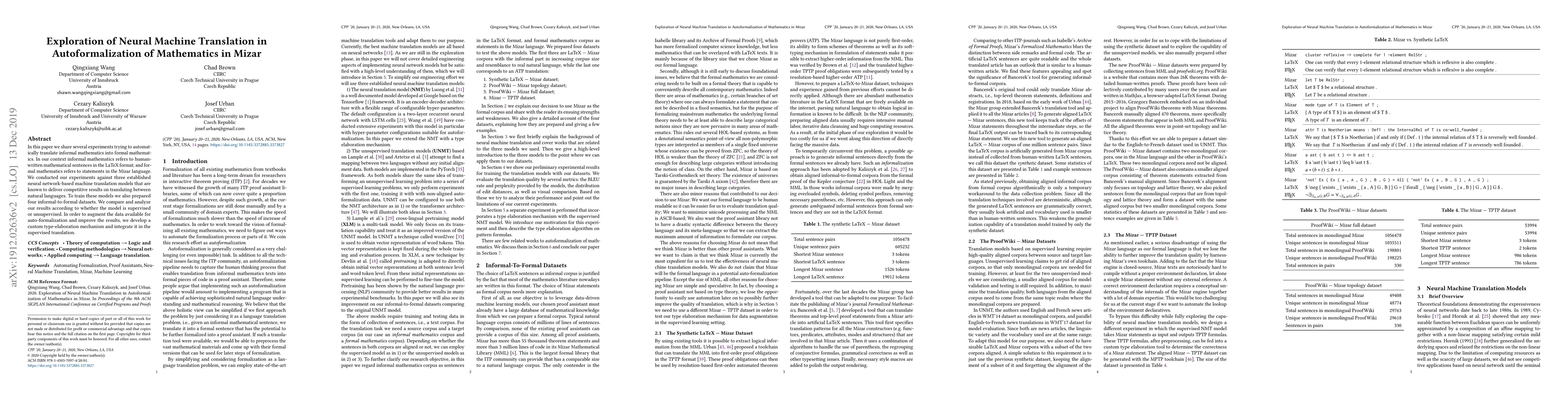 This research investigates the use of neural machine translation to convert informal mathematical sentences in LaTeX into formal Mizar language. Experiments utilize three neural network-based models and four datasets, with a focus on supervised versus unsupervised learning, and introduce a custom type-elaboration mechanism to enhance translation quality.