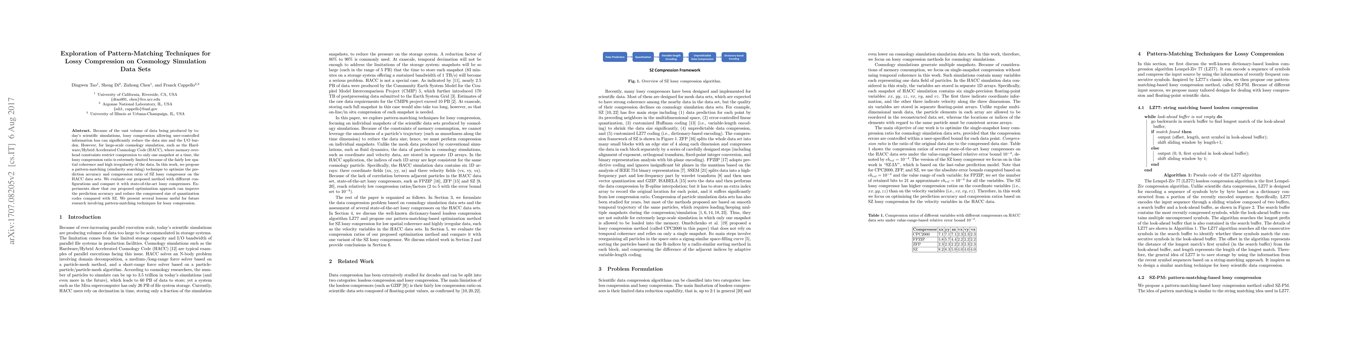 Because of the vast volume of data being produced by today's scientific simulations, lossy compression allowing user-controlled information loss can significantly reduce the data size and the I/O burden. However, for large-scale cosmology simulation, such as the Hardware/Hybrid Accelerated Cosmology Code (HACC), where memory overhead constraints restrict compression to only one snapshot at a time, the lossy compression ratio is extremely limited because of the fairly low spatial coherence and high irregularity of the data. In this work, we propose a pattern-matching (similarity searching) technique to optimize the prediction accuracy and compression ratio of SZ lossy compressor on the HACC data sets. We evaluate our proposed method with different configurations and compare it with state-of-the-art lossy compressors. Experiments show that our proposed optimization approach can improve the prediction accuracy and reduce the compressed size of quantization codes compared with SZ. We present several lessons useful for future research involving pattern-matching techniques for lossy compression.