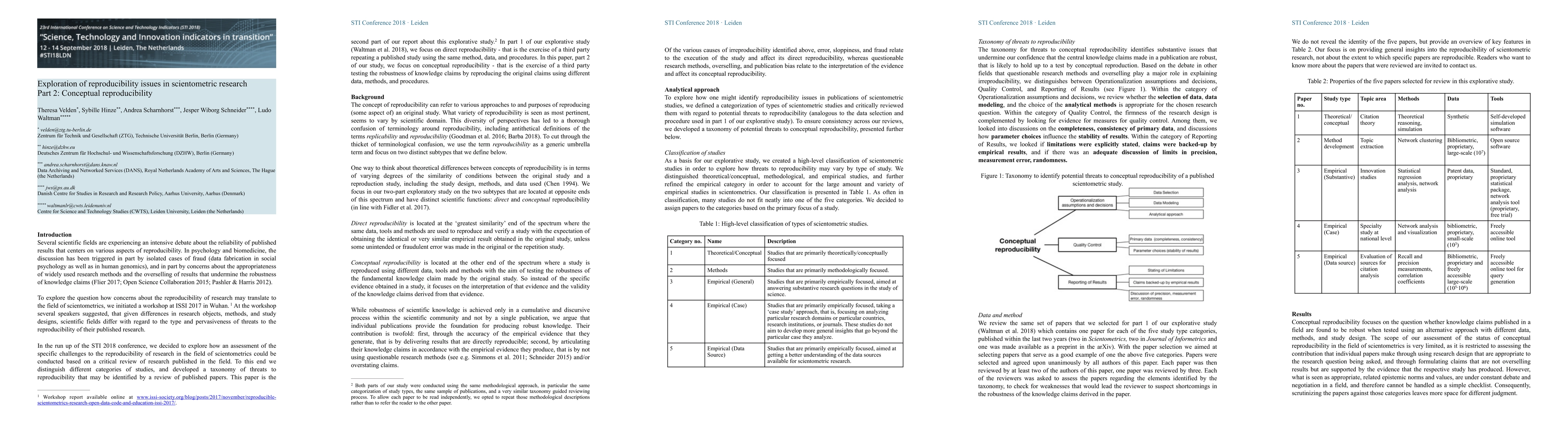 This is the second part of a small-scale explorative study in an effort to assess reproducibility issues specific to scientometrics research. This effort is motivated by the desire to generate empirical data to inform debates about reproducibility in scientometrics. Rather than attempt to reproduce studies, we explore how we might assess "in principle" reproducibility based on a critical review of the content of published papers. While the first part of the study (Waltman et al. 2018) focuses on direct reproducibility - that is the ability to reproduce the specific evidence produced by an original study using the same data, methods, and procedures, this second part is dedicated to conceptual reproducibility - that is the robustness of knowledge claims towards verification by an alternative approach using different data, methods and procedures. The study is exploratory: it investigates only a very limited number of publications and serves us to develop instruments for identifying potential reproducibility issues of published studies: These are a categorization of study types and a taxonomy of threats to reproducibility. We work with a select sample of five publications in scientometrics covering a variation of study types of theoretical, methodological, and empirical nature. Based on observations made during our exploratory review, we conclude with open questions on how to approach and assess the status of conceptual reproducibility in scientometrics intended for discussion at the special track on "Reproducibility in Scientometrics" at STI2018 in Leiden.