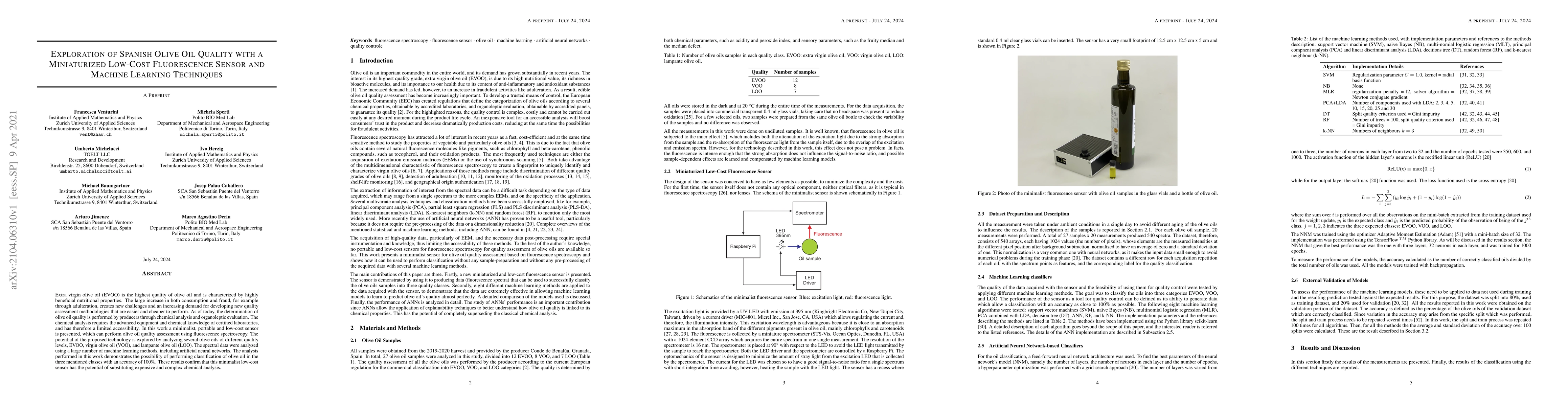 This research explores the use of a low-cost fluorescence sensor and machine learning to assess the quality of Spanish olive oils, including extra virgin, virgin, and lampante olive oil. The study demonstrates 100% accuracy in classifying oils using spectral data and artificial neural networks, suggesting the potential for a cost-effective alternative to traditional chemical analysis.