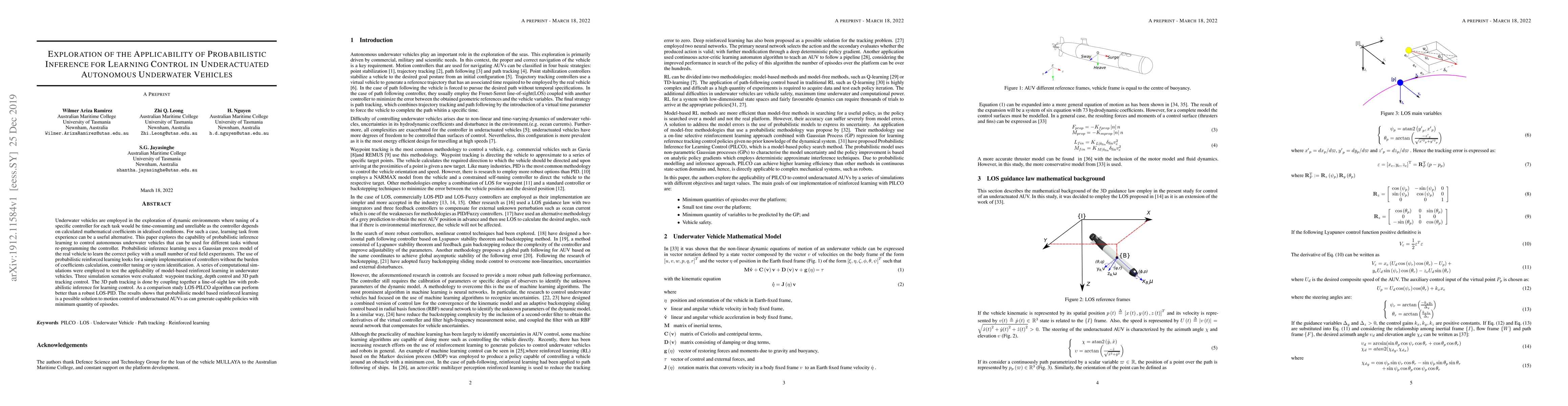 This paper investigates the use of probabilistic inference learning for controlling autonomous underwater vehicles (AUVs) to perform various tasks without re-programming. It employs Gaussian process models and probabilistic reinforced learning to develop effective control policies with minimal real-world experiments.