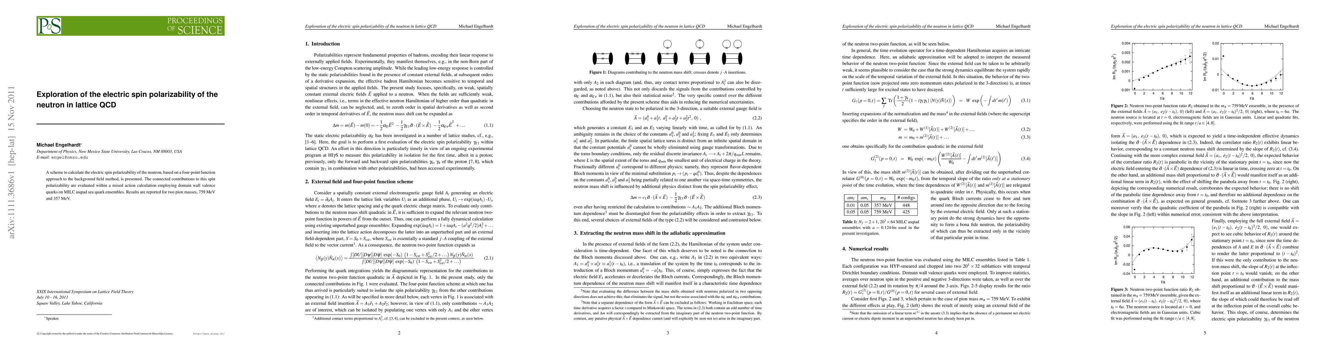 This research presents a method to calculate the electric spin polarizability of the neutron using lattice QCD, employing a four-point function approach and mixed action calculations with domain wall valence quarks on MILC asqtad ensembles. Results are reported for two pion masses, 759 MeV and 357 MeV.