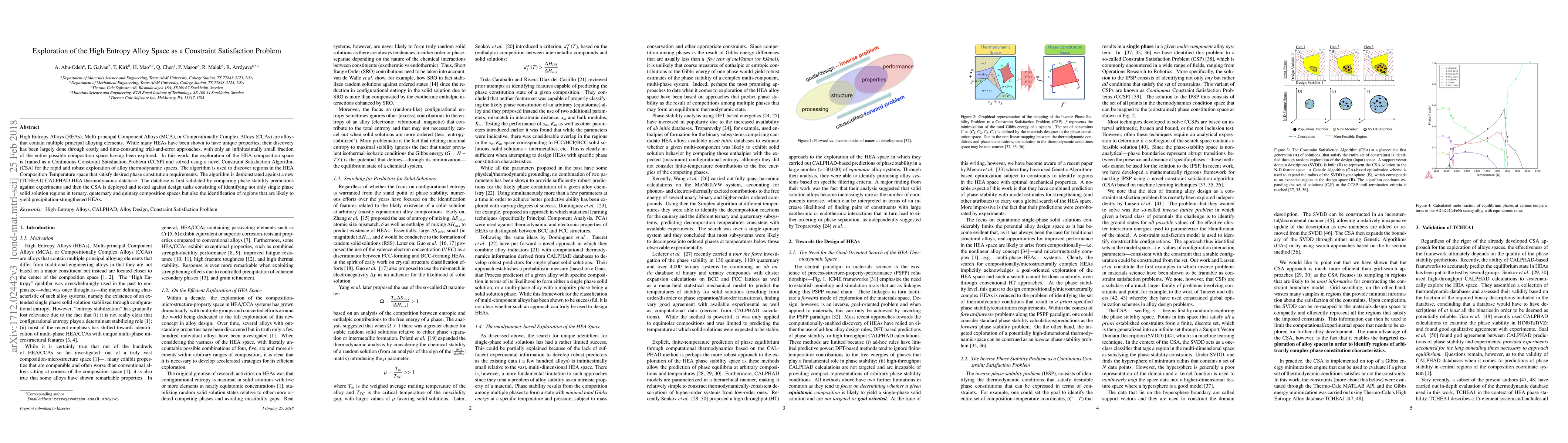 High Entropy Alloys (HEAs), Multi-principal Component Alloys (MCA), or Compositionally Complex Alloys (CCAs) are alloys that contain multiple principal alloying elements. While many HEAs have been shown to have unique properties, their discovery has been largely done through costly and time-consuming trial-and-error approaches, with only an infinitesimally small fraction of the entire possible composition space having been explored. In this work, the exploration of the HEA composition space is framed as a Continuous Constraint Satisfaction Problem (CCSP) and solved using a novel Constraint Satisfaction Algorithm (CSA) for the rapid and robust exploration of alloy thermodynamic spaces. The algorithm is used to discover regions in the HEA Composition-Temperature space that satisfy desired phase constitution requirements. The algorithm is demonstrated against a new (TCHEA1) CALPHAD HEA thermodynamic database. The database is first validated by comparing phase stability predictions against experiments and then the CSA is deployed and tested against design tasks consisting of identifying not only single phase solid solution regions in ternary, quaternary and quinary composition spaces but also the identification of regions that are likely to yield precipitation-strengthened HEAs.