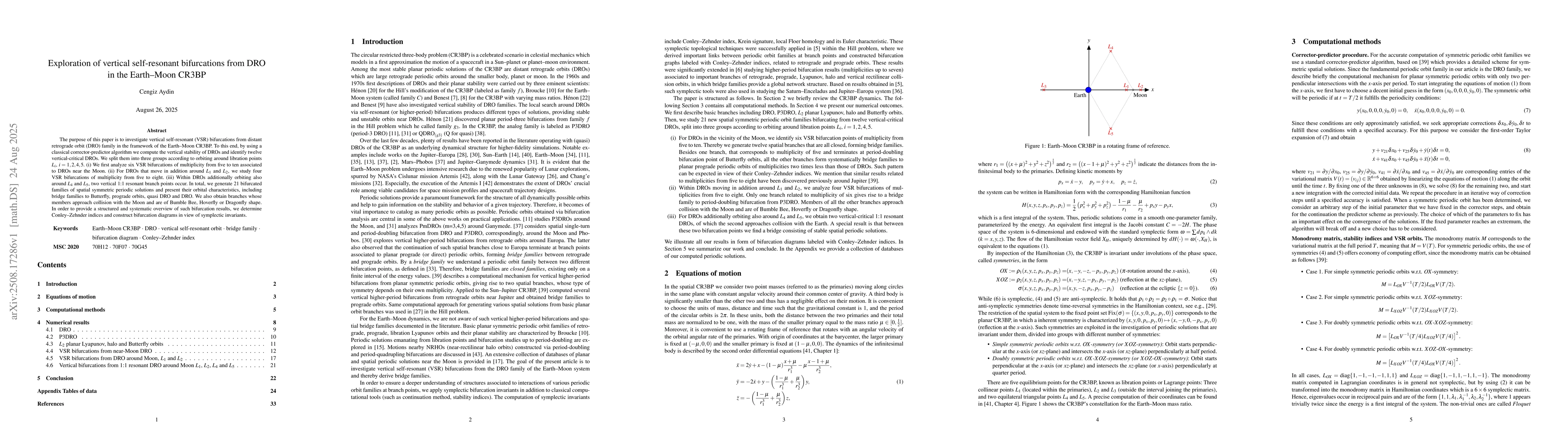 The purpose of this paper is to investigate vertical self-resonant (VSR) bifurcations from distant retrograde orbit (DRO) family in the framework of the Earth-Moon CR3BP. To this end, by using a classical corrector-predictor algorithm we compute the vertical stability of DROs and identify twelve vertical-critical DROs. We split them into three groups according to orbiting around libration points $L_i$, $i=1,2,4,5$. (i) We first analyze six VSR bifurcations of multiplicity from five to ten associated to DROs near the Moon. (ii) For DROs that move in addition around $L_1$ and $L_2$, we study four VSR bifurcations of multiplicity from five to eight. (iii) Within DROs additionally orbiting also around $L_4$ and $L_5$, two vertical 1:1 resonant branch points occur. In total, we generate 21 bifurcated families of spatial symmetric periodic solutions and present their orbital characteristics, including bridge families to Butterfly, prograde orbits, quasi DRO and DRO. We also obtain branches whose members approach collision with the Moon and are of Bumble Bee, Hoverfly or Dragonfly shape. In order to provide a structured and systematic overview of such bifurcation results, we determine Conley-Zehnder indices and construct bifurcation diagrams in view of symplectic invariants.