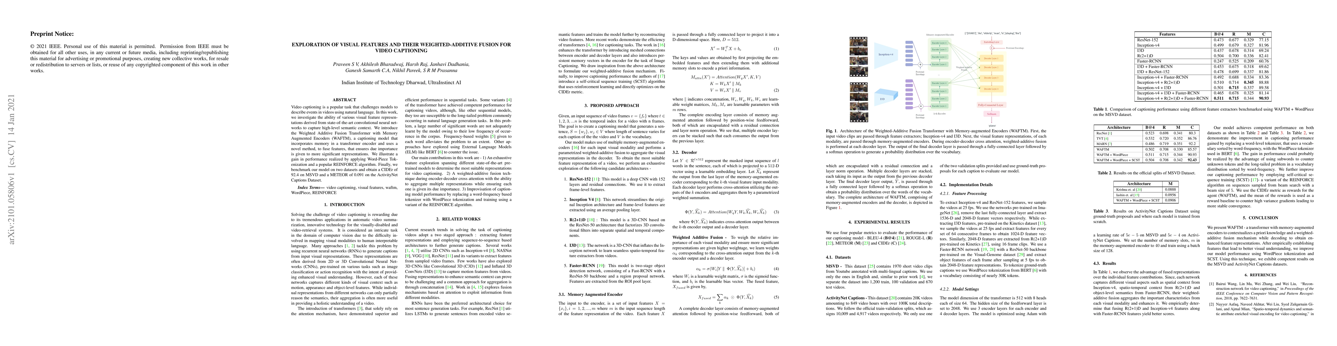 This paper explores the use of various visual feature representations for video captioning, introducing a Weighted Additive Fusion Transformer with Memory Augmented Encoders (WAFTM) that fuses features with importance weighting. The model achieves improved performance using Word-Piece Tokenization and REINFORCE algorithm, achieving CIDEr of 92.4 on MSVD and METEOR of 0.091 on ActivityNet Captions Dataset.