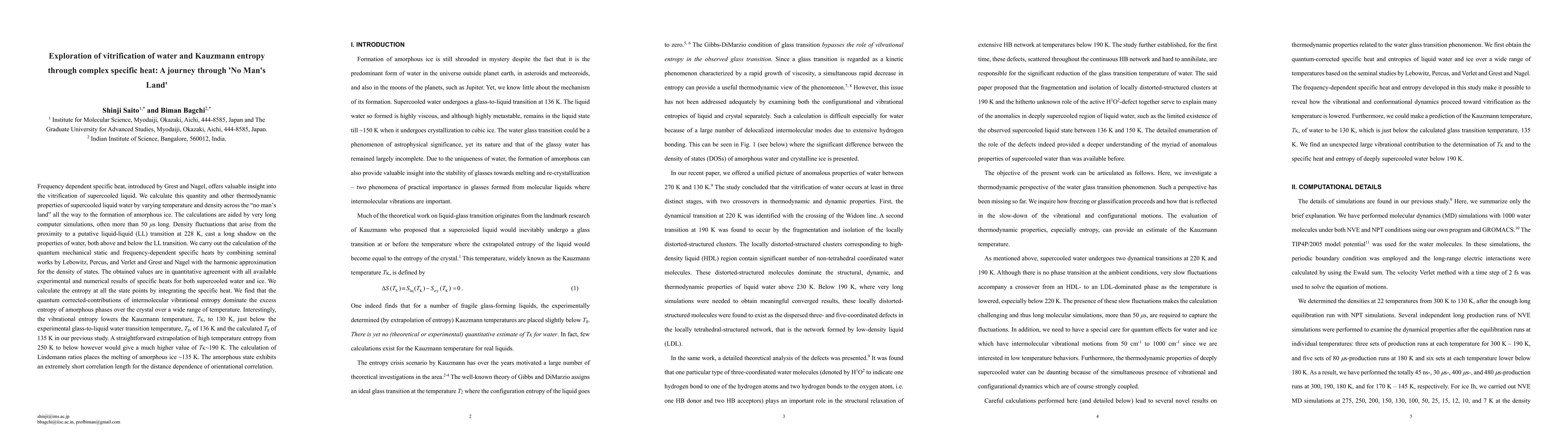This paper explores the vitrification of supercooled liquid water and the Kauzmann paradox using frequency-dependent specific heat, revealing that quantum mechanical contributions dominate the excess entropy in amorphous phases. The study finds the Kauzmann temperature to be 130 K, close to experimental glass transition temperatures.