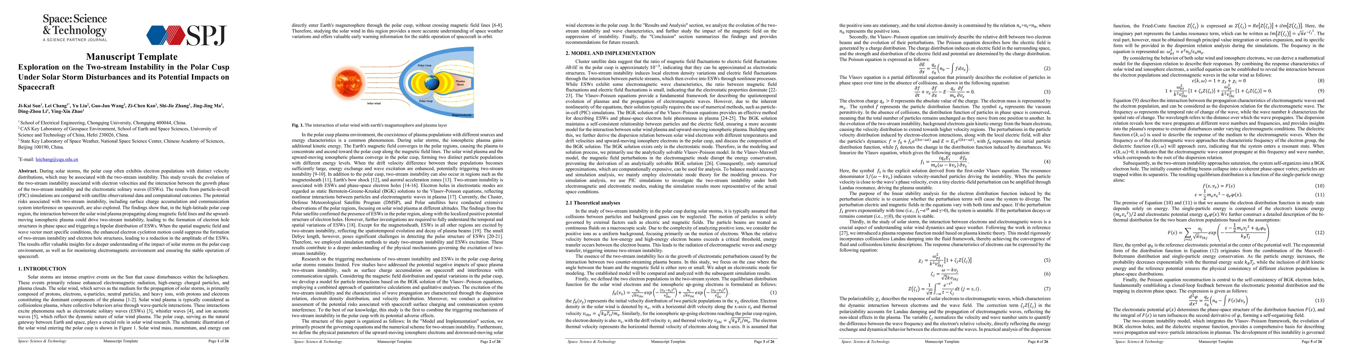 During solar storms, the polar cusp often exhibits electron populations with distinct velocity distributions, which may be associated with the two-stream instability. This study reveals the evolution of the two-stream instability associated with electron velocities and the interaction between the growth phase of the two-stream instability and the electrostatic solitary waves (ESWs). The results from particle-in-cell (PIC) simulations are compared with satellite observational data and computational outcomes. The potential risks associated with two-stream instability, including surface charge accumulation and communication system interference on spacecraft, are also explored. The findings show that, in the high-latitude polar cusp region, the interaction between the solar wind plasma propagating along magnetic field lines and the upward-moving ionospheric plasma could drive two-stream instability, leading to the formation of electron hole structures in phase space and triggering a bipolar distribution of ESWs. When the spatial magnetic field and wave vector meet specific conditions, the enhanced electron cyclotron motion could suppress the formation of two-stream instability and electron hole structures, leading to a reduction in the amplitude of the ESWs. The results offer valuable insights for a deeper understanding of the impact of solar storms on the polar cusp environment, as well as for monitoring electromagnetic environment and ensuring the stable operation of spacecraft.