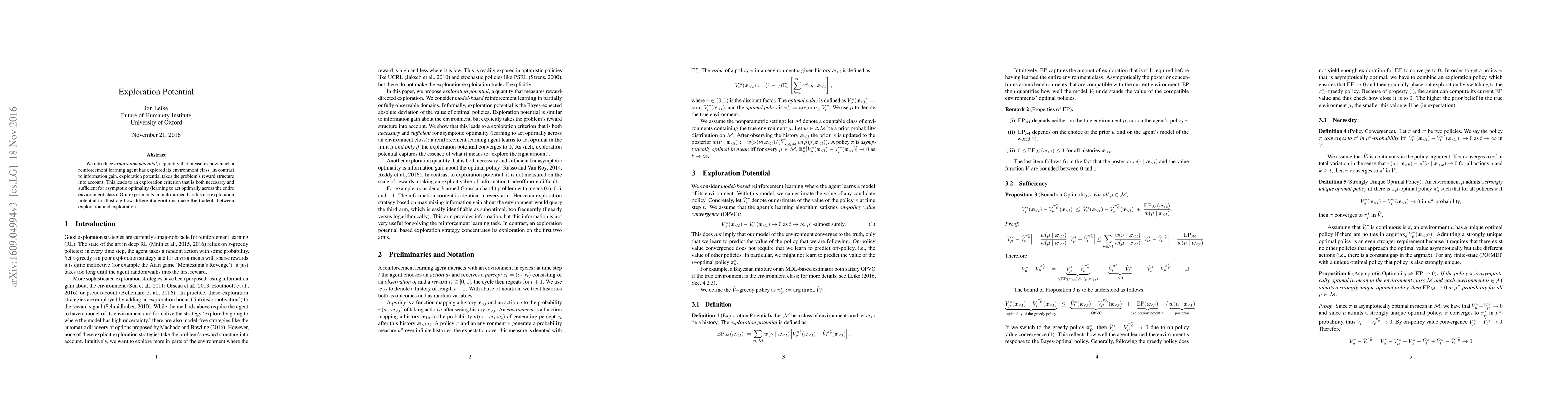 Researchers introduce exploration potential to measure how much a reinforcement learning agent explores its environment, finding it leads to an optimal criterion for asymptotic optimality in multi-armed bandits experiments.