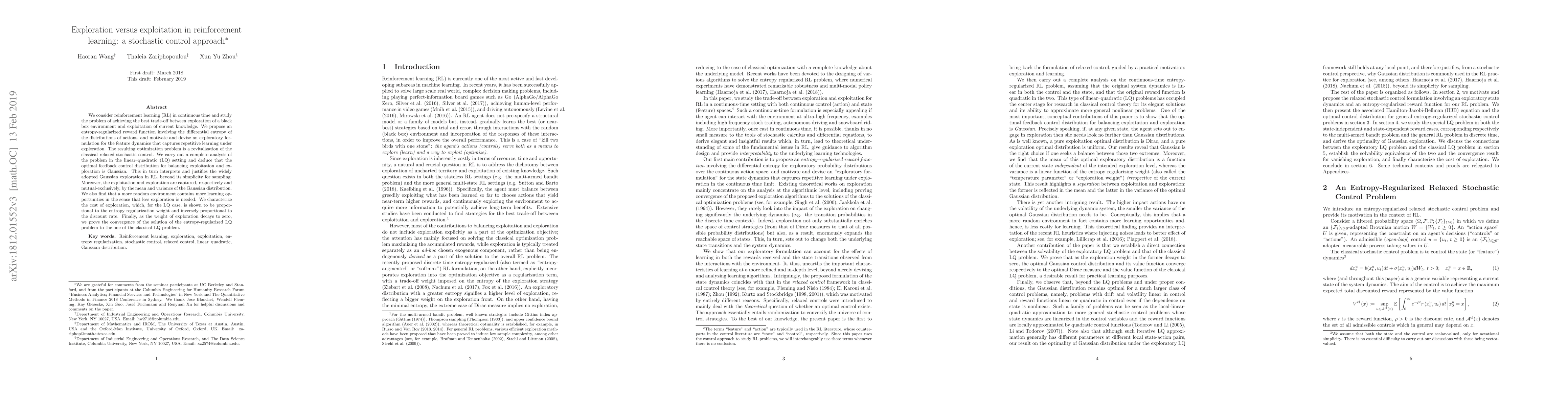 This paper explores the balance between exploration and exploitation in continuous-time reinforcement learning using a stochastic control approach, proposing an entropy-regularized reward function. The optimal control strategy is shown to be Gaussian, justifying its use in RL, and the cost of exploration is characterized in terms of entropy regularization and discount rate.