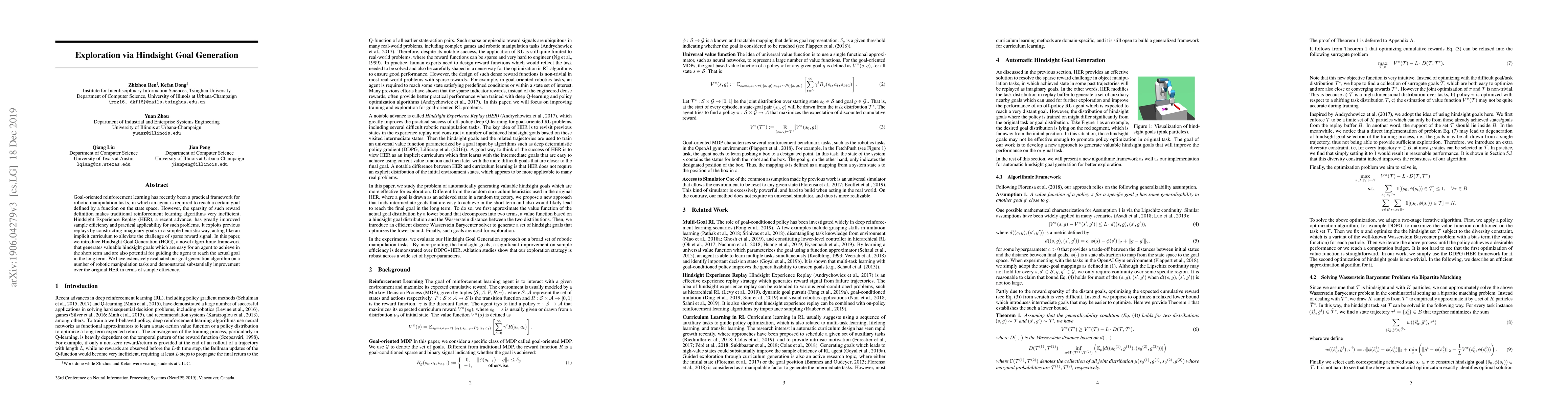 This paper introduces Hindsight Goal Generation (HGG), a novel algorithm that generates valuable hindsight goals for robotic manipulation tasks, improving sample efficiency over traditional methods.
