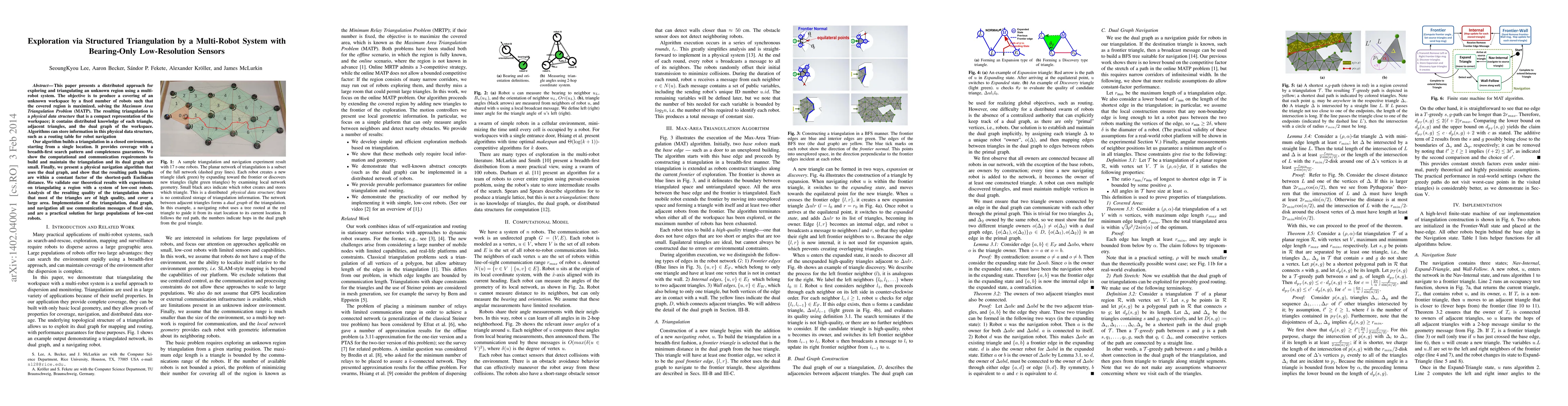 This paper presents a distributed approach for exploring and triangulating an unknown region using a multi- robot system. The objective is to produce a covering of an unknown workspace by a fixed number of robots such that the covered region is maximized, solving the Maximum Area Triangulation Problem (MATP). The resulting triangulation is a physical data structure that is a compact representation of the workspace; it contains distributed knowledge of each triangle, adjacent triangles, and the dual graph of the workspace. Algorithms can store information in this physical data structure, such as a routing table for robot navigation Our algorithm builds a triangulation in a closed environment, starting from a single location. It provides coverage with a breadth-first search pattern and completeness guarantees. We show the computational and communication requirements to build and maintain the triangulation and its dual graph are small. Finally, we present a physical navigation algorithm that uses the dual graph, and show that the resulting path lengths are within a constant factor of the shortest-path Euclidean distance. We validate our theoretical results with experiments on triangulating a region with a system of low-cost robots. Analysis of the resulting quality of the triangulation shows that most of the triangles are of high quality, and cover a large area. Implementation of the triangulation, dual graph, and navigation all use communication messages of fixed size, and are a practical solution for large populations of low-cost robots.