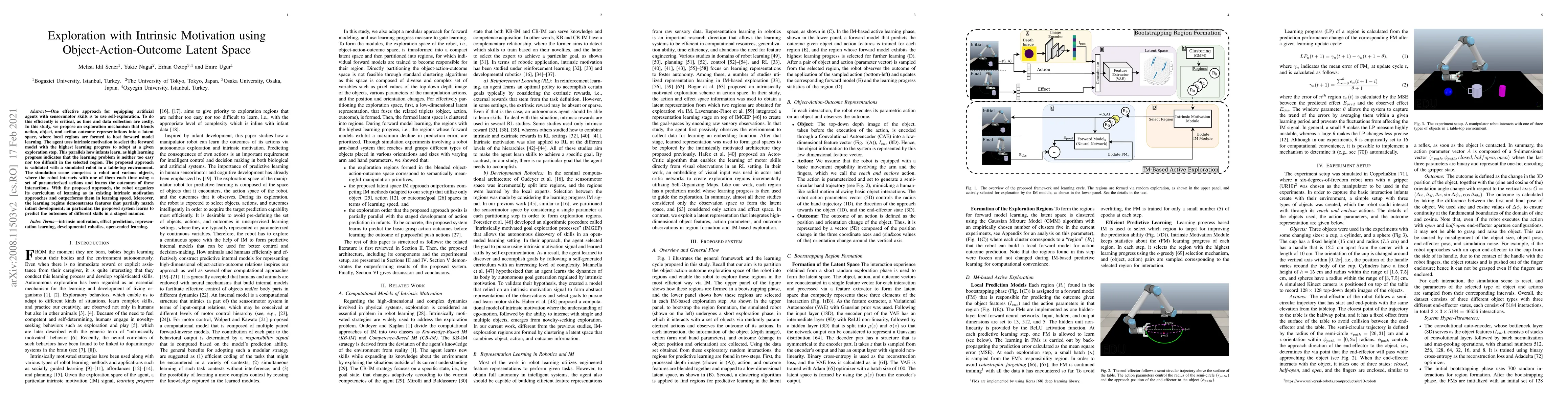One effective approach for equipping artificial agents with sensorimotor skills is to use self-exploration. To do this efficiently is critical, as time and data collection are costly. In this study, we propose an exploration mechanism that blends action, object, and action outcome representations into a latent space, where local regions are formed to host forward model learning. The agent uses intrinsic motivation to select the forward model with the highest learning progress to adopt at a given exploration step. This parallels how infants learn, as high learning progress indicates that the learning problem is neither too easy nor too difficult in the selected region. The proposed approach is validated with a simulated robot in a table-top environment. The simulation scene comprises a robot and various objects, where the robot interacts with one of them each time using a set of parameterized actions and learns the outcomes of these interactions. With the proposed approach, the robot organizes its curriculum of learning as in existing intrinsic motivation approaches and outperforms them in learning speed. Moreover, the learning regime demonstrates features that partially match infant development; in particular, the proposed system learns to predict the outcomes of different skills in a staged manner.