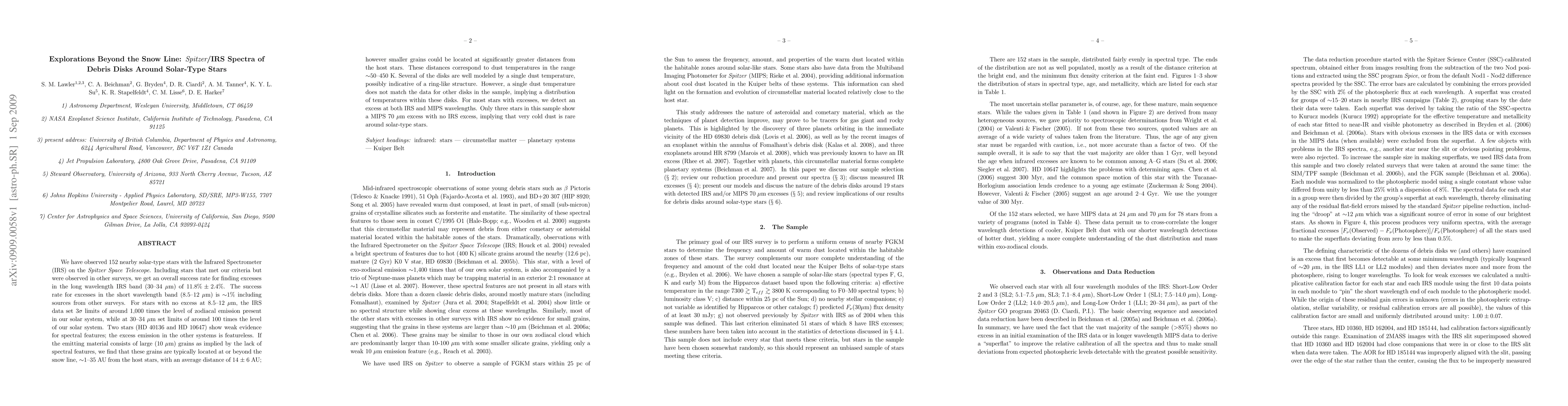 We have observed 152 nearby solar-type stars with the Infrared Spectrometer (IRS) on the Spitzer Space Telescope. Including stars that met our criteria but were observed in other surveys, we get an overall success rate for finding excesses in the long wavelength IRS band (30-34 micron) of 11.8% +/- 2.4%. The success rate for excesses in the short wavelength band (8.5-12 micron) is ~1% including sources from other surveys. For stars with no excess at 8.5-12 microns, the IRS data set 3 sigma limits of around 1,000 times the level of zodiacal emission present in our solar system, while at 30-34 microns set limits of around 100 times the level of our solar system. Two stars (HD 40136 and HD 10647) show weak evidence for spectral features; the excess emission in the other systems is featureless. If the emitting material consists of large (10 micron) grains as implied by the lack of spectral features, we find that these grains are typically located at or beyond the snow line, ~1-35 AU from the host stars, with an average distance of 14 +/- 6 AU; however smaller grains could be located at significantly greater distances from the host stars. These distances correspond to dust temperatures in the range ~50-450 K. Several of the disks are well modeled by a single dust temperature, possibly indicative of a ring-like structure. However, a single dust temperature does not match the data for other disks in the sample, implying a distribution of temperatures within these disks. For most stars with excesses, we detect an excess at both IRS and MIPS wavelengths. Only three stars in this sample show a MIPS 70 micron excess with no IRS excess, implying that very cold dust is rare around solar-type stars.