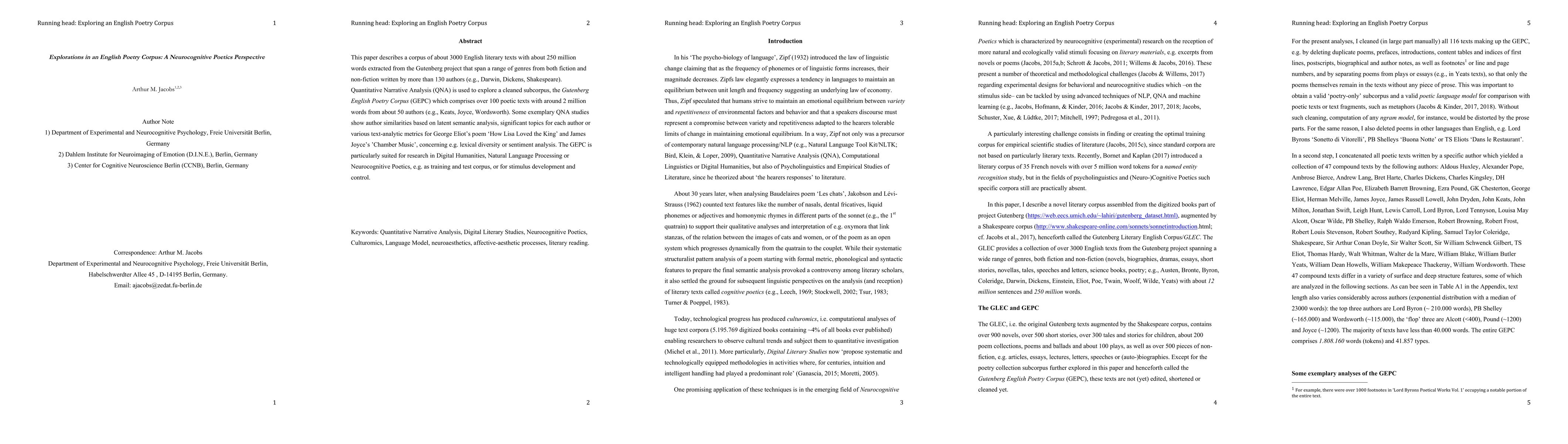 This paper describes a corpus of about 3000 English literary texts with about 250 million words extracted from the Gutenberg project that span a range of genres from both fiction and non-fiction written by more than 130 authors (e.g., Darwin, Dickens, Shakespeare). Quantitative Narrative Analysis (QNA) is used to explore a cleaned subcorpus, the Gutenberg English Poetry Corpus (GEPC) which comprises over 100 poetic texts with around 2 million words from about 50 authors (e.g., Keats, Joyce, Wordsworth). Some exemplary QNA studies show author similarities based on latent semantic analysis, significant topics for each author or various text-analytic metrics for George Eliot's poem 'How Lisa Loved the King' and James Joyce's 'Chamber Music', concerning e.g. lexical diversity or sentiment analysis. The GEPC is particularly suited for research in Digital Humanities, Natural Language Processing or Neurocognitive Poetics, e.g. as training and test corpus, or for stimulus development and control.