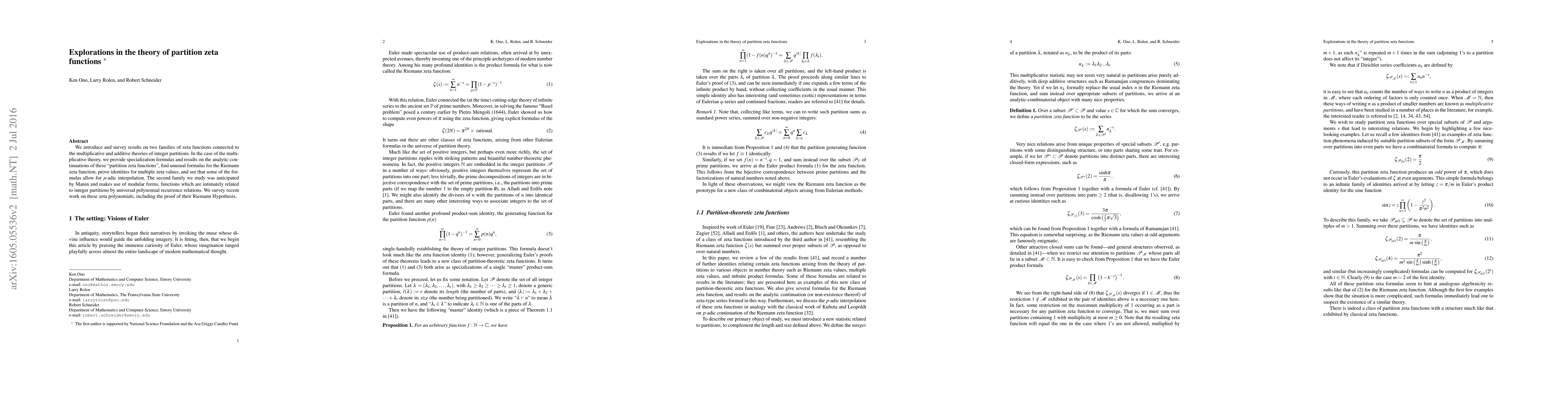 We introduce and survey results on two families of zeta functions connected to the multiplicative and additive theories of integer partitions. In the case of the multiplicative theory, we provide specialization formulas and results on the analytic continuations of these "partition zeta functions", find unusual formulas for the Riemann zeta function, prove identities for multiple zeta values, and see that some of the formulas allow for $p$-adic interpolation. The second family we study was anticipated by Manin and makes use of modular forms, functions which are intimately related to integer partitions by universal polynomial recurrence relations. We survey recent work on these zeta polynomials, including the proof of their Riemann Hypothesis.