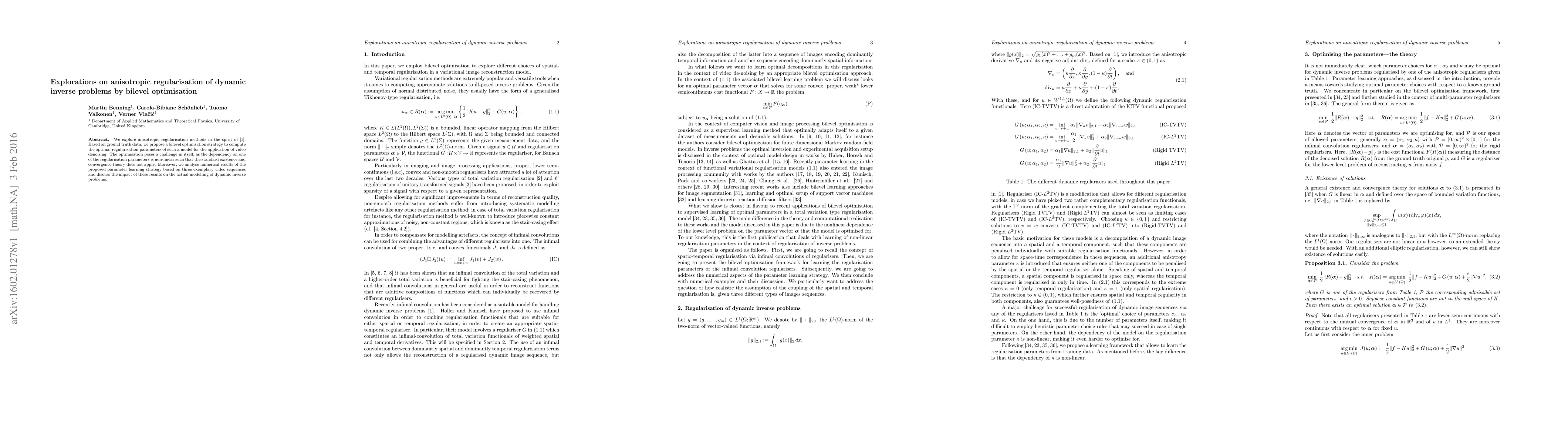 This paper proposes anisotropic regularisation methods for dynamic inverse problems, employing a bilevel optimisation strategy to determine optimal regularisation parameters for video denoising. The non-linear dependency on one parameter complicates standard optimisation theory, and the study evaluates the effectiveness of the proposed method on three video sequences.