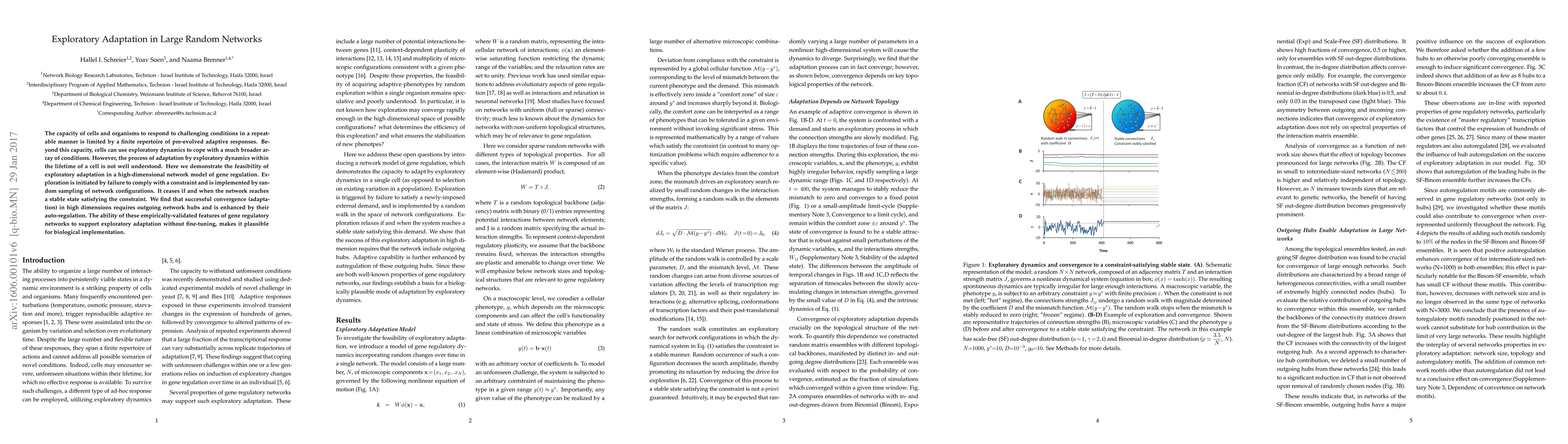 The capacity of cells and organisms to respond to challenging conditions in a repeatable manner is limited by a finite repertoire of pre-evolved adaptive responses. Beyond this capacity, cells can use exploratory dynamics to cope with a much broader array of conditions. However, the process of adaptation by exploratory dynamics within the lifetime of a cell is not well understood. Here we demonstrate the feasibility of exploratory adaptation in a high-dimensional network model of gene regulation. Exploration is initiated by failure to comply with a constraint and is implemented by random sampling of network configurations. It ceases if and when the network reaches a stable state satisfying the constraint. We find that successful convergence (adaptation) in high dimensions requires outgoing network hubs and is enhanced by their auto-regulation. The ability of these empirically-validated features of gene regulatory networks to support exploratory adaptation without fine-tuning, makes it plausible for biological implementation.