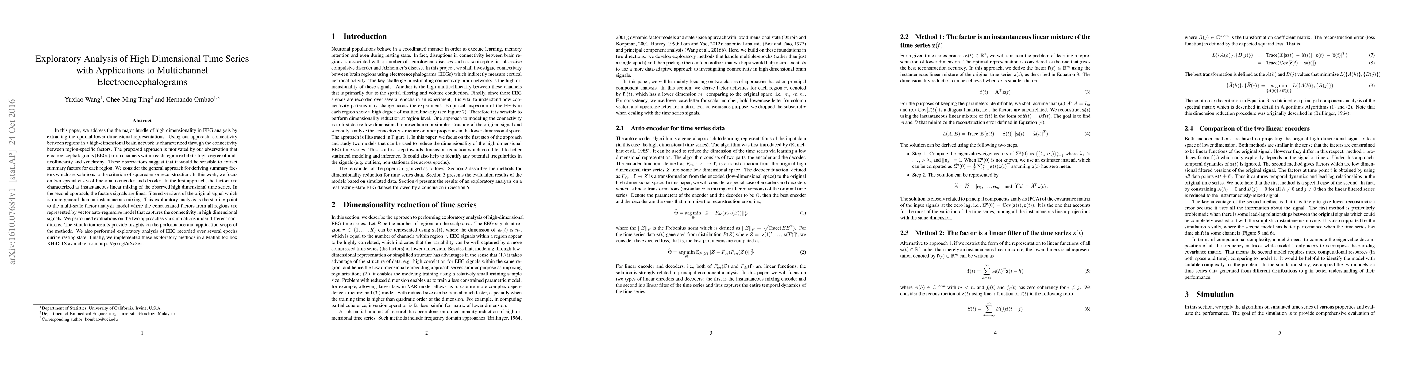 In this paper, we address the the major hurdle of high dimensionality in EEG analysis by extracting the optimal lower dimensional representations. Using our approach, connectivity between regions in a high-dimensional brain network is characterized through the connectivity between region-specific factors. The proposed approach is motivated by our observation that electroencephalograms (EEGs) from channels within each region exhibit a high degree of multicollinearity and synchrony. These observations suggest that it would be sensible to extract summary factors for each region. We consider the general approach for deriving summary factors which are solutions to the criterion of squared error reconstruction. In this work, we focus on two special cases of linear auto encoder and decoder. In the first approach, the factors are characterized as instantaneous linear mixing of the observed high dimensional time series. In the second approach, the factors signals are linear filtered versions of the original signal which is more general than an instantaneous mixing. This exploratory analysis is the starting point to the multi-scale factor analysis model where the concatenated factors from all regions are represented by vector auto-regressive model that captures the connectivity in high dimensional signals. We performed evaluations on the two approaches via simulations under different conditions. The simulation results provide insights on the performance and application scope of the methods. We also performed exploratory analysis of EEG recorded over several epochs during resting state. Finally, we implemented these exploratory methods in a Matlab toolbox XHiDiTS available from https://goo.gl/uXc8ei .