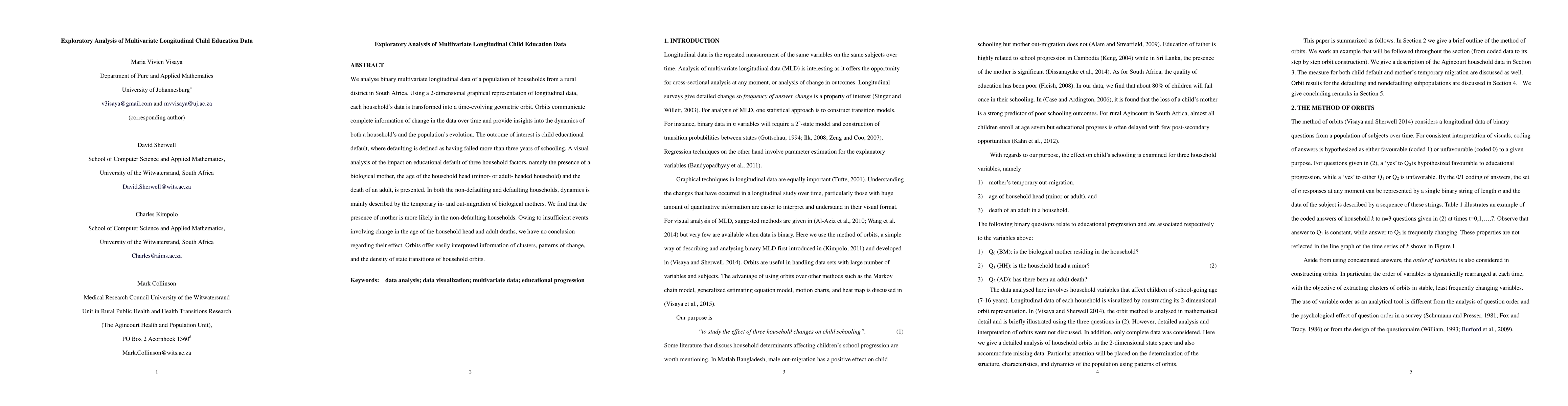 We analyse binary multivariate longitudinal data of a population of households from a rural district in South Africa. Using a 2-dimensional graphical representation of longitudinal data, each household's data is transformed into a time-evolving geometric orbit. Orbits communicate complete information of change in the data over time and provide insights into the dynamics of both a household's and the population's evolution. The outcome of interest is child educational default, where defaulting is defined as having failed more than three years of schooling. A visual analysis of the impact on educational default of three household factors, namely the presence of a biological mother, the age of the household head (minor- or adult- headed household) and the death of an adult, is presented. In both the non-defaulting and defaulting households, dynamics is mainly described by the temporary in- and out-migration of biological mothers. We find that the presence of mother is more likely in the non-defaulting households. Owing to insufficient events involving change in the age of the household head and adult deaths, we have no conclusion regarding their effect. Orbits offer easily interpreted information of clusters, patterns of change, and the density of state transitions of household orbits.