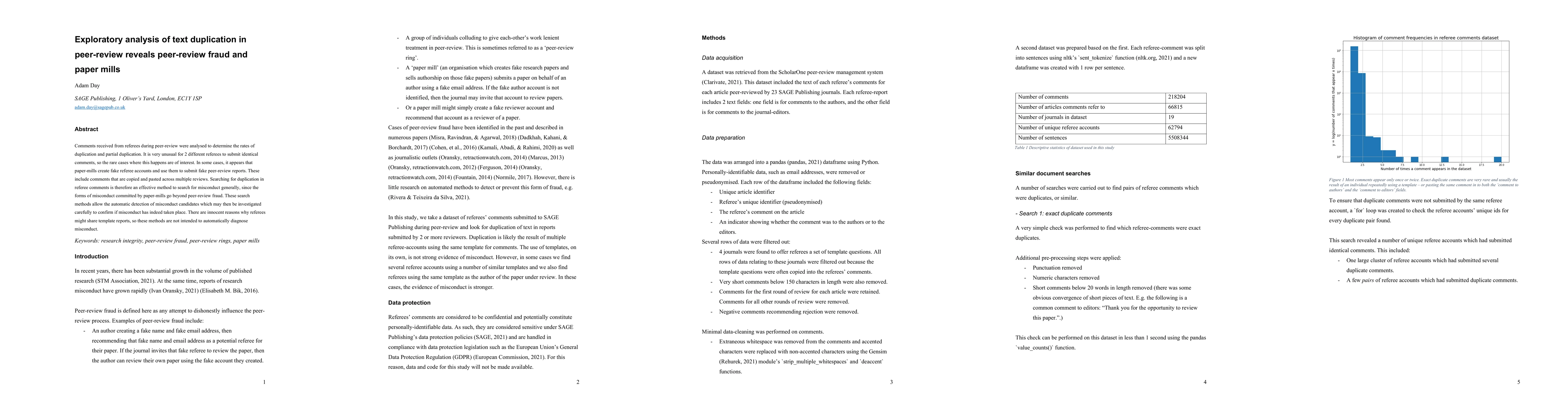 Comments received from referees during peer-review were analysed to determine the rates of duplication and partial duplication. It is very unusual for 2 different referees to submit identical comments, so the rare cases where this happens are of interest. In some cases, it appears that paper-mills create fake referee accounts and use them to submit fake peer-review reports. These include comments that are copied and pasted across multiple reviews. Searching for duplication in referee comments is therefore an effective method to search for misconduct generally, since the forms of misconduct committed by paper-mills go beyond peer-review fraud. These search methods allow the automatic detection of misconduct candidates which may then be investigated carefully to confirm if misconduct has indeed taken place. There are innocent reasons why referees might share template reports, so these methods are not intended to automatically diagnose misconduct.