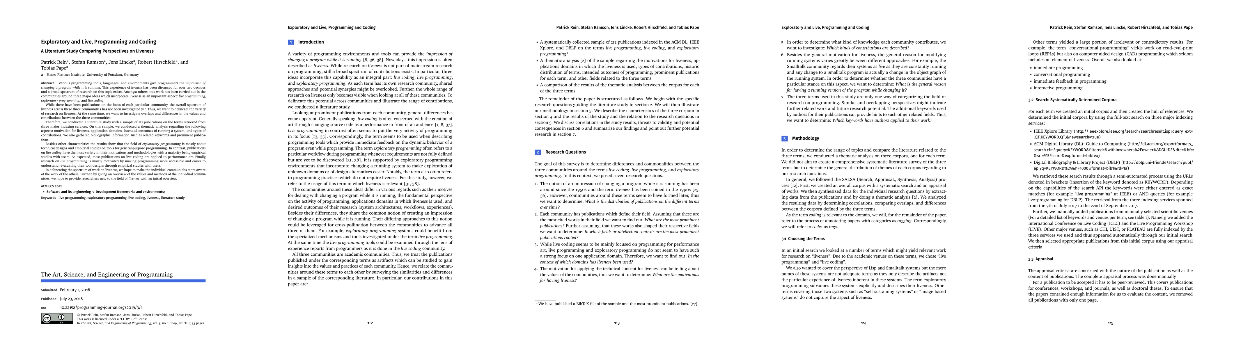 This study explores the concept of liveness in programming and coding, comparing perspectives from live programming, exploratory programming, and live coding communities. It reveals differences in motivations, methodologies, and application domains across these fields, providing a comprehensive overview of the spectrum of research on liveness.