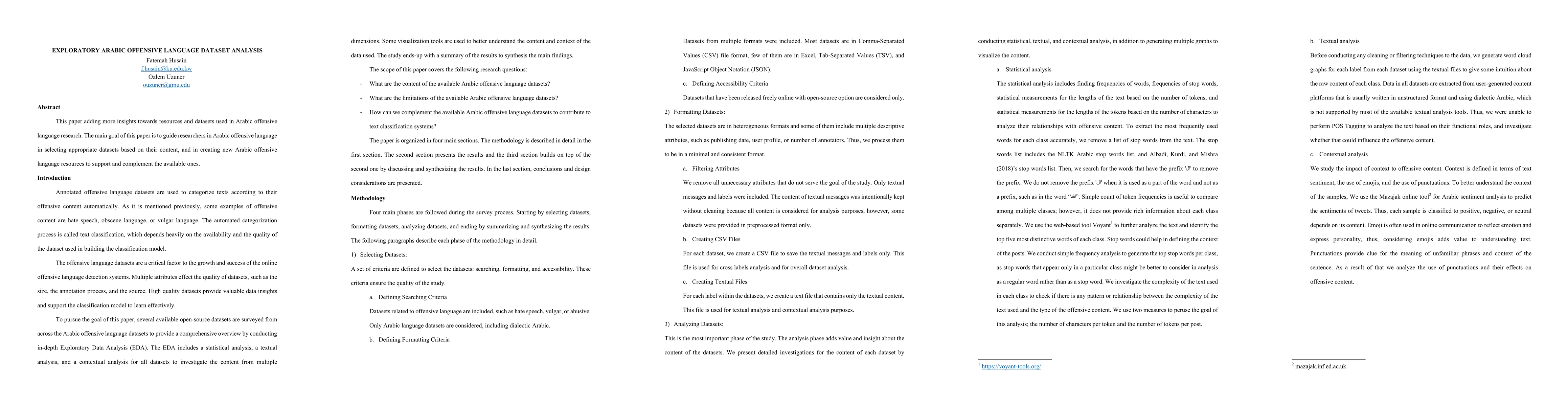 This paper provides an analysis of existing Arabic offensive language datasets to assist researchers in selecting suitable resources and highlights the need for creating new complementary datasets to support ongoing research. It aims to enhance the quality and diversity of data available for studying Arabic offensive language.