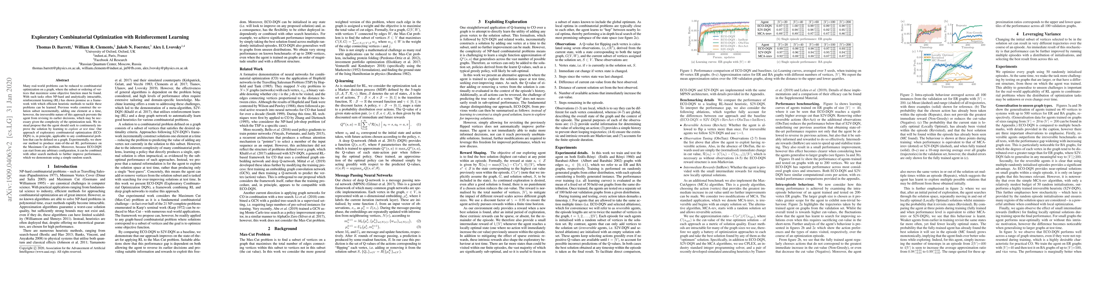 This paper proposes a reinforcement learning approach called exploratory combinatorial optimization (ECO-DQN) to tackle NP-hard combinatorial optimization problems on graphs. Unlike previous methods, ECO-DQN allows the agent to continuously revise its decisions, leading to state-of-the-art performance on the Maximum Cut problem.