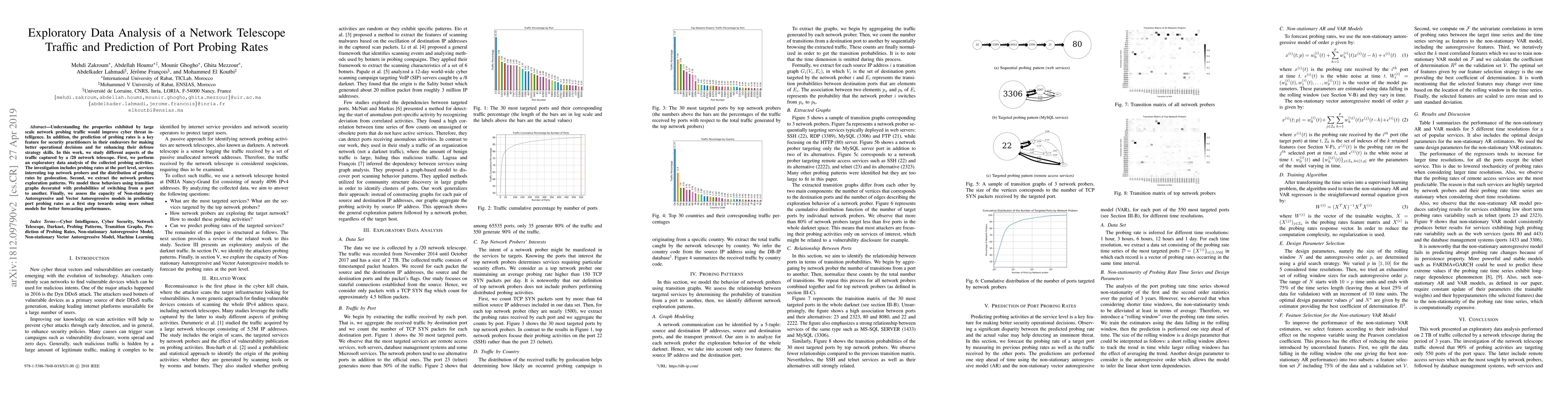 Understanding the properties exhibited by large scale network probing traffic would improve cyber threat intelligence. In addition, the prediction of probing rates is a key feature for security practitioners in their endeavors for making better operational decisions and for enhancing their defense strategy skills. In this work, we study different aspects of the traffic captured by a /20 network telescope. First, we perform an exploratory data analysis of the collected probing activities. The investigation includes probing rates at the port level, services interesting top network probers and the distribution of probing rates by geolocation. Second, we extract the network probers exploration patterns. We model these behaviors using transition graphs decorated with probabilities of switching from a port to another. Finally, we assess the capacity of Non-stationary Autoregressive and Vector Autoregressive models in predicting port probing rates as a first step towards using more robust models for better forecasting performance.