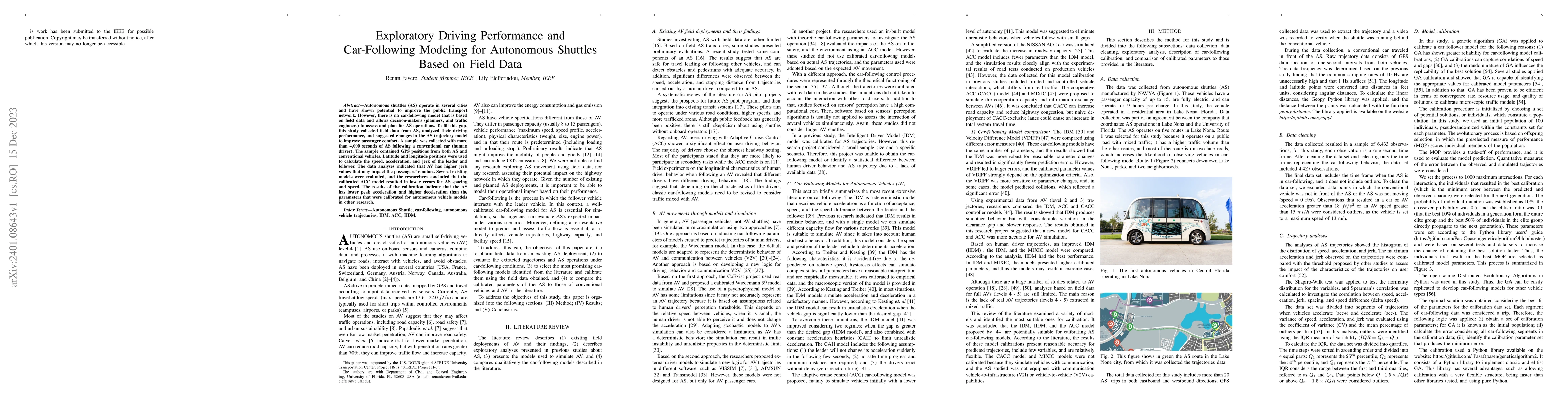 This study analyzes field data from autonomous shuttles (AS) to develop a car-following model based on real-world driving performance, finding higher jerk values in AS that affect passenger comfort. The calibrated adaptive cruise control (ACC) model showed lower errors in AS spacing and speed, indicating lower peak acceleration and higher deceleration compared to other autonomous vehicle models.