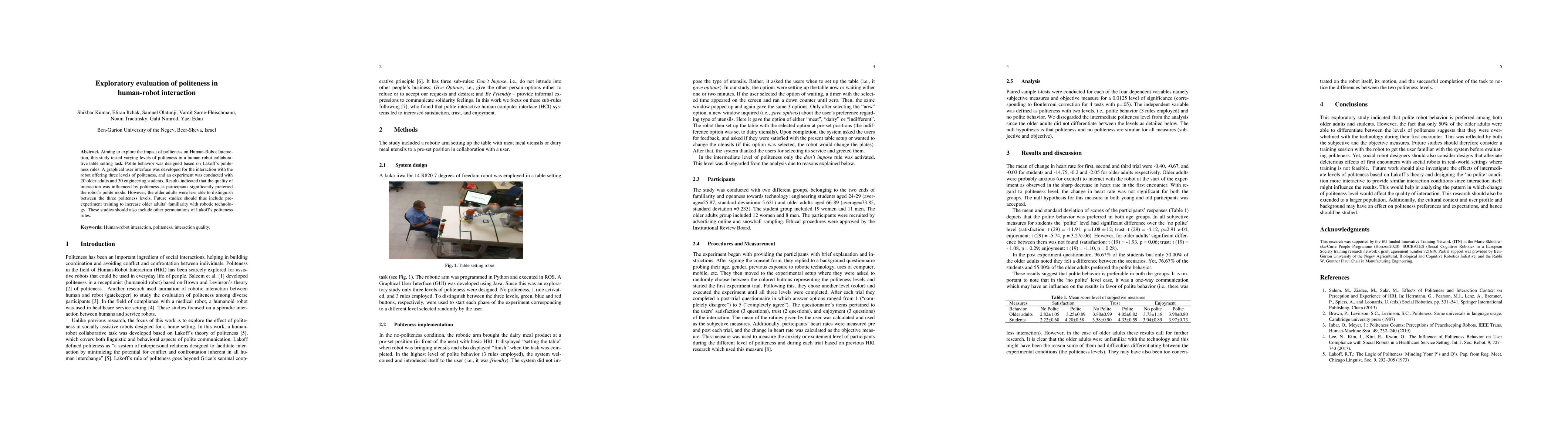 Aiming to explore the impact of politeness on Human robot interaction, this study tested varying levels of politeness in a human robot collaborative table setting task. Polite behaviour was designed based on the politeness rules of Lakoff. A graphical user interface was developed for the interaction with the robot offering three levels of politeness, and an experiment was conducted with 20 older adults and 30 engineering students. Results indicated that the quality of interaction was influenced by politeness as participants significantly preferred the polite mode of the robot. However, the older adults were less able to distinguish between the three politeness levels. Future studies should thus include pre experiment training to increase the familiarity of the older adults with robotic technology. These studies should also include other permutations of the politeness rules of Lakoff.