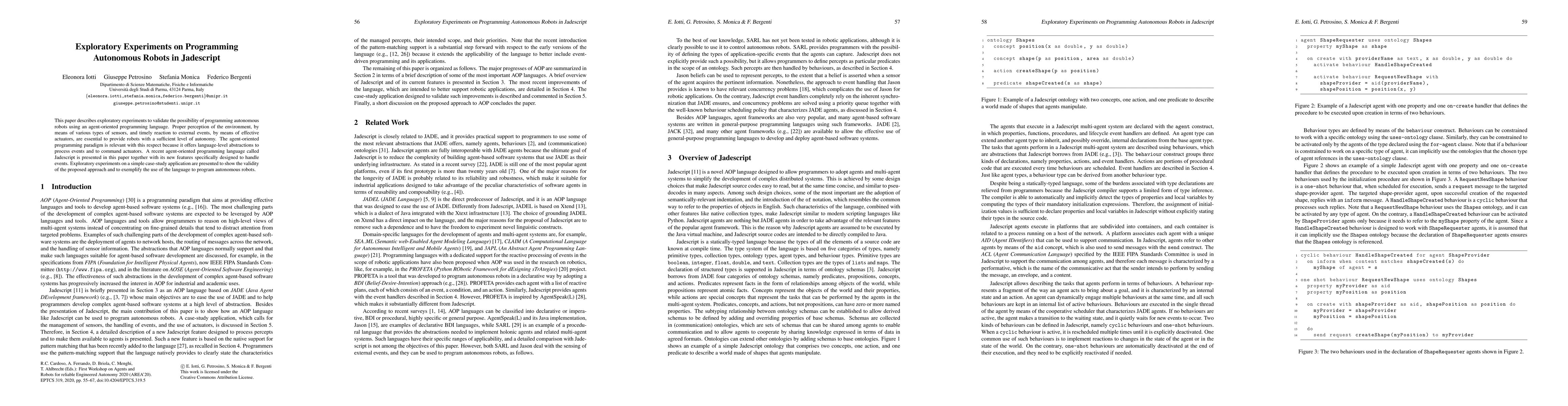 This paper describes exploratory experiments to validate the possibility of programming autonomous robots using an agent-oriented programming language. Proper perception of the environment, by means of various types of sensors, and timely reaction to external events, by means of effective actuators, are essential to provide robots with a sufficient level of autonomy. The agent-oriented programming paradigm is relevant with this respect because it offers language-level abstractions to process events and to command actuators. A recent agent-oriented programming language called Jadescript is presented in this paper together with its new features specifically designed to handle events. Exploratory experiments on a simple case-study application are presented to show the validity of the proposed approach and to exemplify the use of the language to program autonomous robots.
