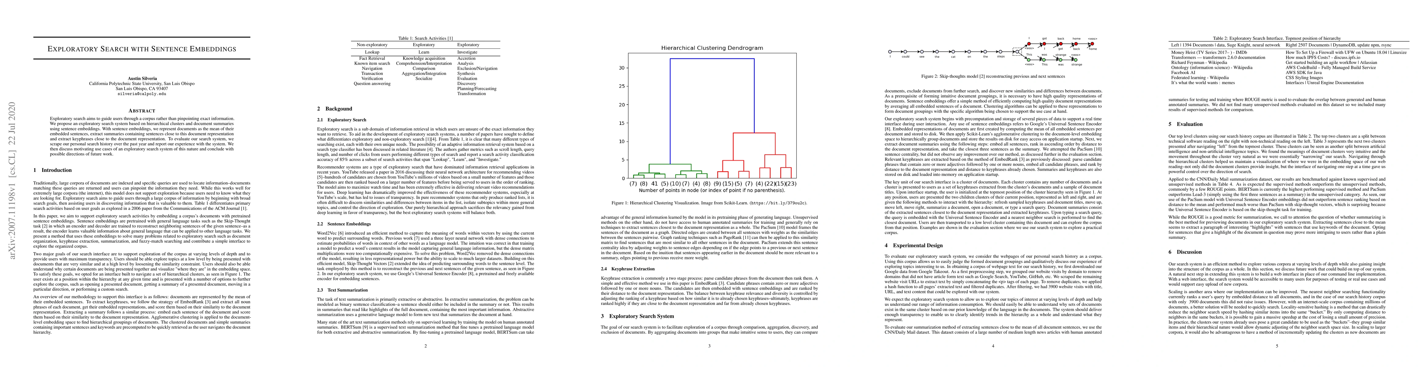 This paper proposes an exploratory search system using hierarchical clusters and document summaries generated from sentence embeddings. The system represents documents by averaging embedded sentences, extracts relevant summaries and keyphrases, and is evaluated using the author's personal search history. The study discusses potential applications and outlines future research directions.