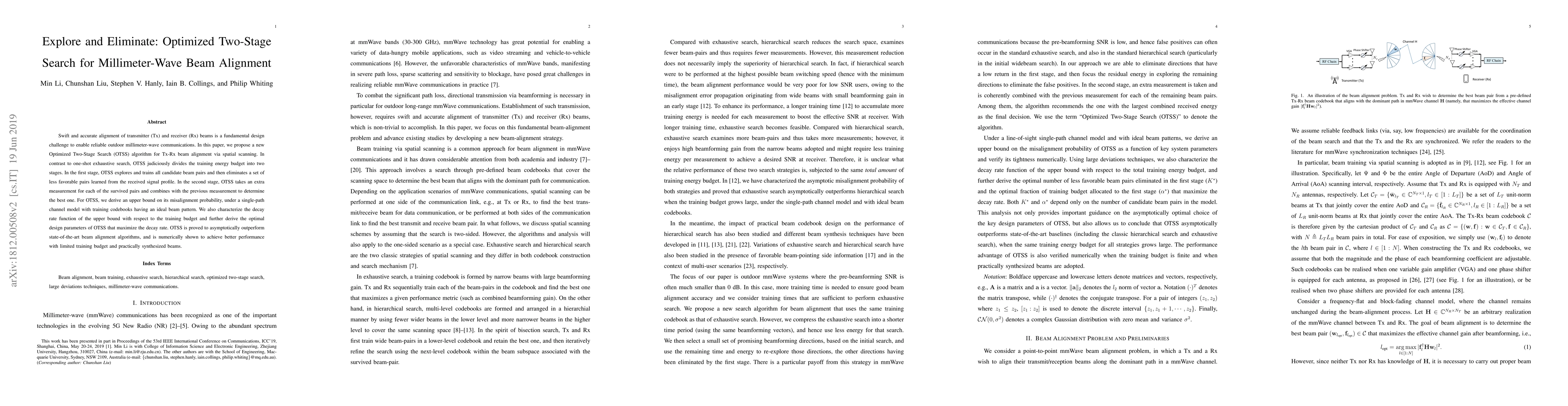 Swift and accurate alignment of transmitter (Tx) and receiver (Rx) beams is a fundamental design challenge to enable reliable outdoor millimeter-wave communications. In this paper, we propose a new Optimized Two-Stage Search (OTSS) algorithm for Tx-Rx beam alignment via spatial scanning. In contrast to one-shot exhaustive search, OTSS judiciously divides the training energy budget into two stages. In the first stage, OTSS explores and trains all candidate beam pairs and then eliminates a set of less favorable pairs learned from the received signal profile. In the second stage, OTSS takes an extra measurement for each of the survived pairs and combines with the previous measurement to determine the best one. For OTSS, we derive an upper bound on its misalignment probability, under a single-path channel model with training codebooks having an ideal beam pattern. We also characterize the decay rate function of the upper bound with respect to the training budget and further derive the optimal design parameters of OTSS that maximize the decay rate. OTSS is proved to asymptotically outperform state-of-the-art beam alignment algorithms, and is numerically shown to achieve better performance with limited training budget and practically synthesized beams.