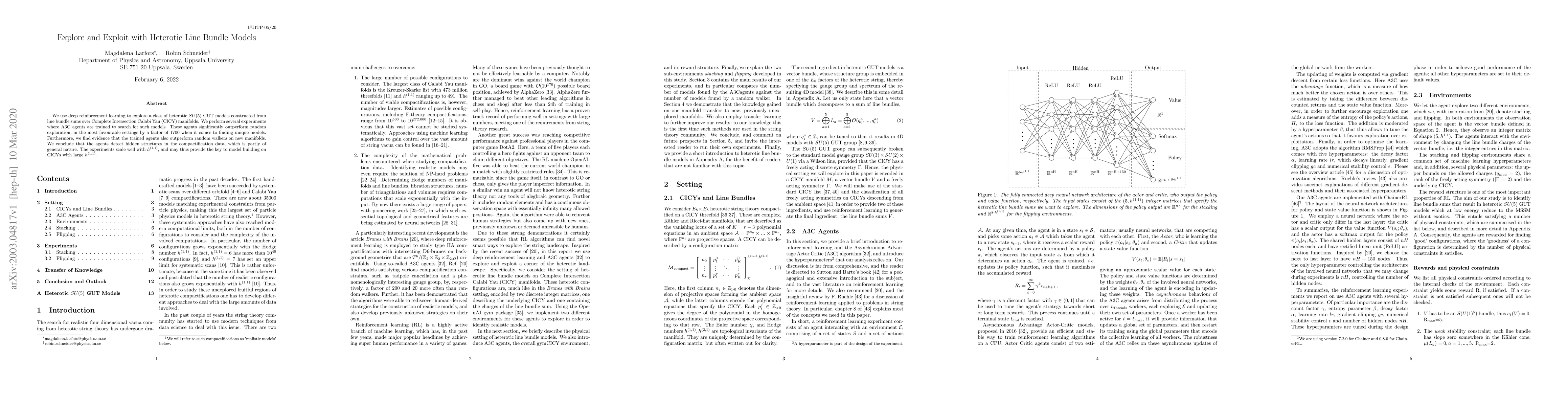 We use deep reinforcement learning to explore a class of heterotic $SU(5)$ GUT models constructed from line bundle sums over Complete Intersection Calabi Yau (CICY) manifolds. We perform several experiments where A3C agents are trained to search for such models. These agents significantly outperform random exploration, in the most favourable settings by a factor of 1700 when it comes to finding unique models. Furthermore, we find evidence that the trained agents also outperform random walkers on new manifolds. We conclude that the agents detect hidden structures in the compactification data, which is partly of general nature. The experiments scale well with $h^{(1,1)}$, and may thus provide the key to model building on CICYs with large $h^{(1,1)}$.